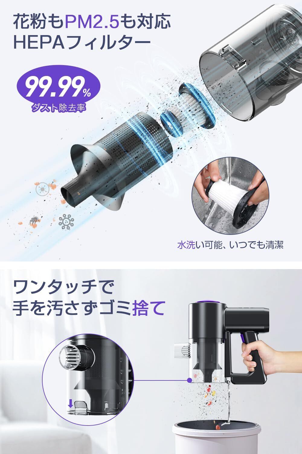【簡単ワンタッチゴミ捨て&収納ブラケット付き】 高性能HEPAフィルターが微細なホコリまでしっかり捕集し、排気もクリーン。フィルターは水洗い可能で、清潔な状態を保てます。ゴミ捨てはダストカップの蓋をワンタッチで開けるだけなので、手を汚さずに処理できて快適。さらに、収納用ブラケットが付属しており、掃除後は壁掛けでコンパクトに収納可能。スペースを取らず、見た目もすっきり保てるハンディークリーナー&コードレス掃除機の理想形です。