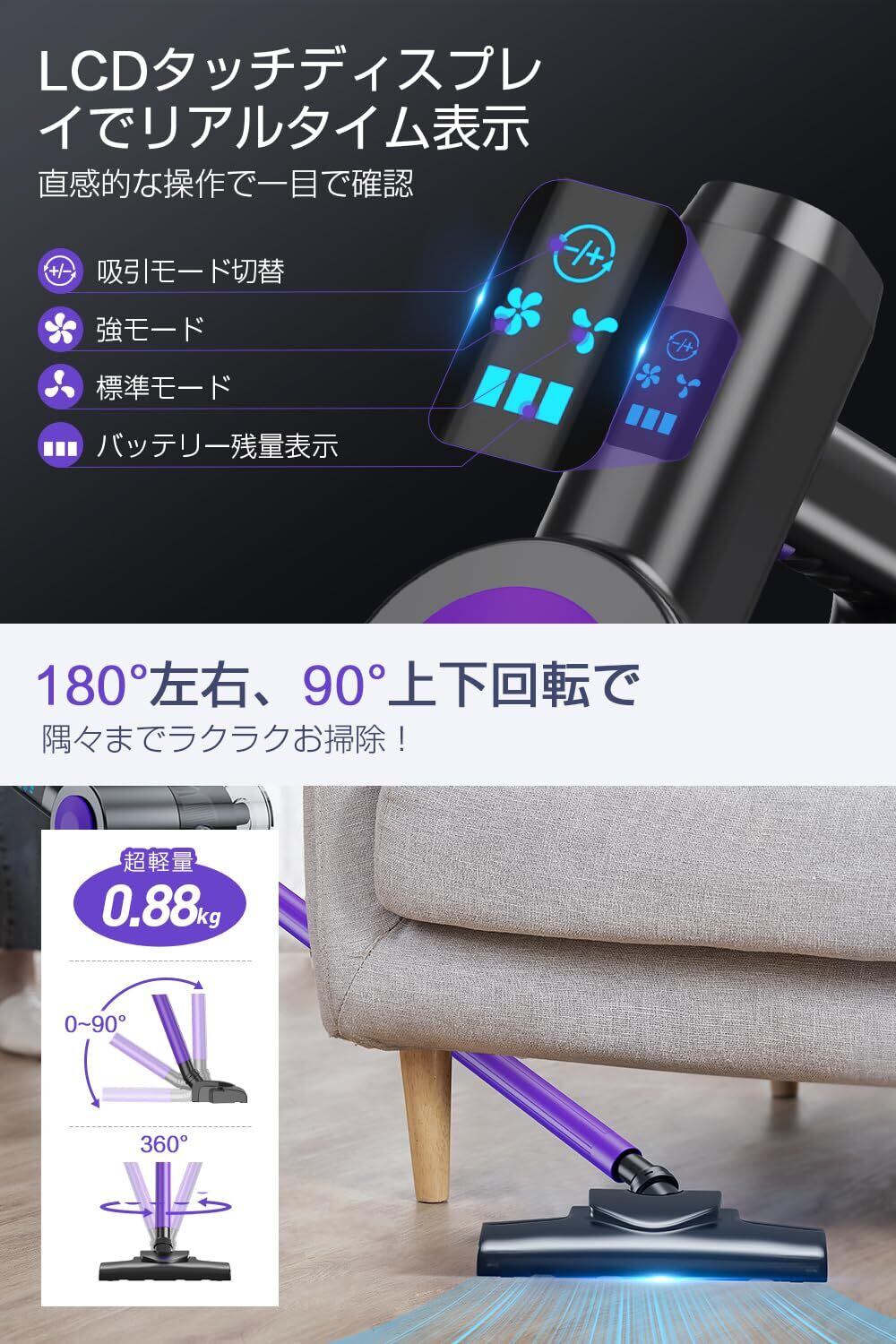 【ヘッド360°回転&軽量ボディで操作性抜群】 ヘッド部分は左右360°、上下90°に自在に動く設計。家具の下や部屋の隅、手の届きにくい場所でもスムーズに掃除できます。また、軽量ボディで長時間の使用でも疲れにくく、女性や高齢の方にも扱いやすい仕様です。軽やかに操作できるスティッククリーナーとして、日々の掃除をもっとラクにします。