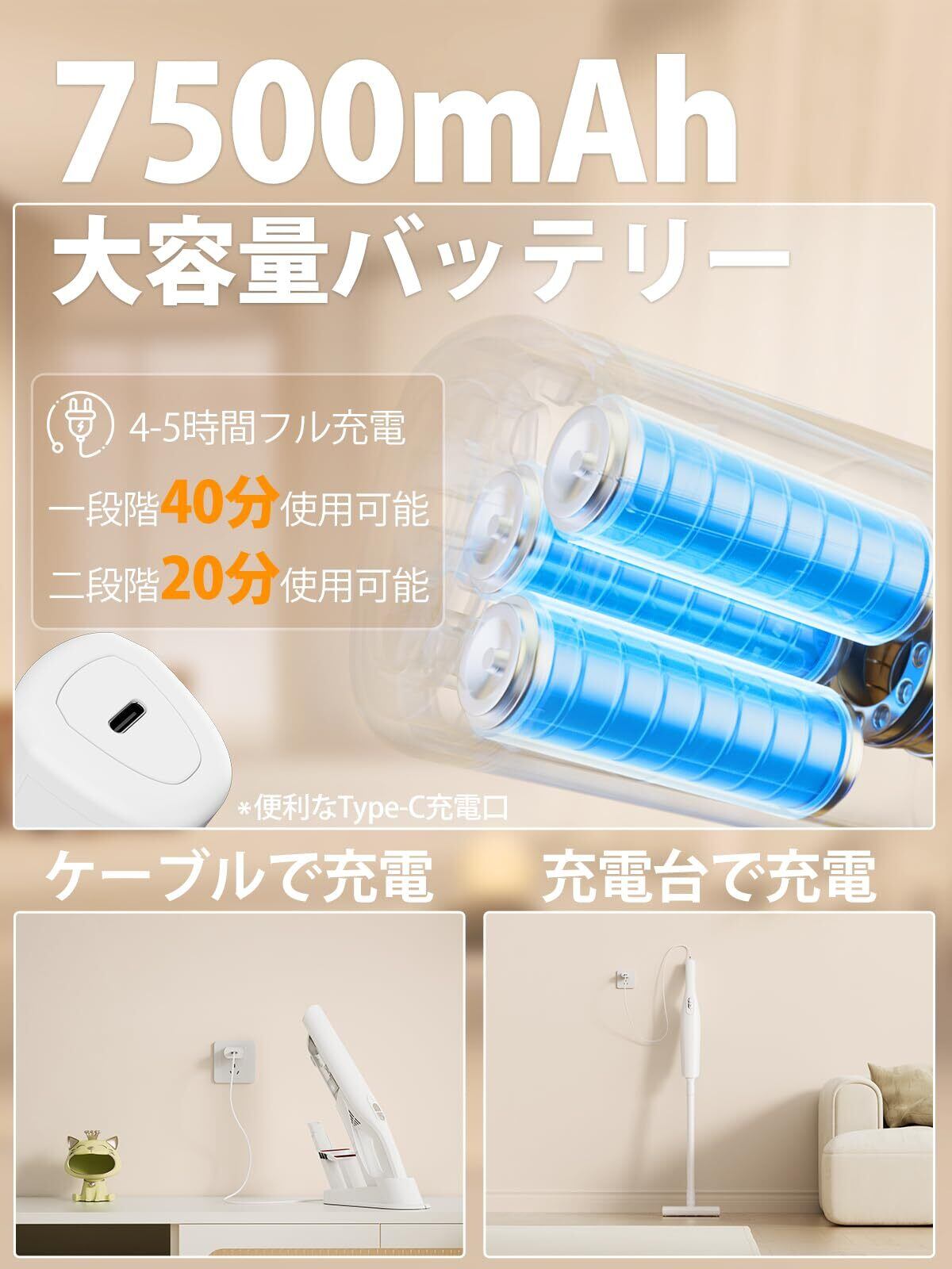✨【2種吸引モード切替最長40分稼働】コードレス掃除機は吸引力と駆動時間が最適化された「エコモード」と、よりパワフルな吸引力が必要なときに便利な「強力モード」を搭載しております。掃除中トリガーを押さえ続けることは不要、強力掃除機の吸引モードもワンタッチで簡単に切り替えます。7500mAhの大容量バッテリーが内蔵され、使用時間はエコモードで最長40分と、強力モードで最長20分間連続稼働が可能です。一人暮らしのお家から一戸建てまでどんなご家庭でも活躍します。