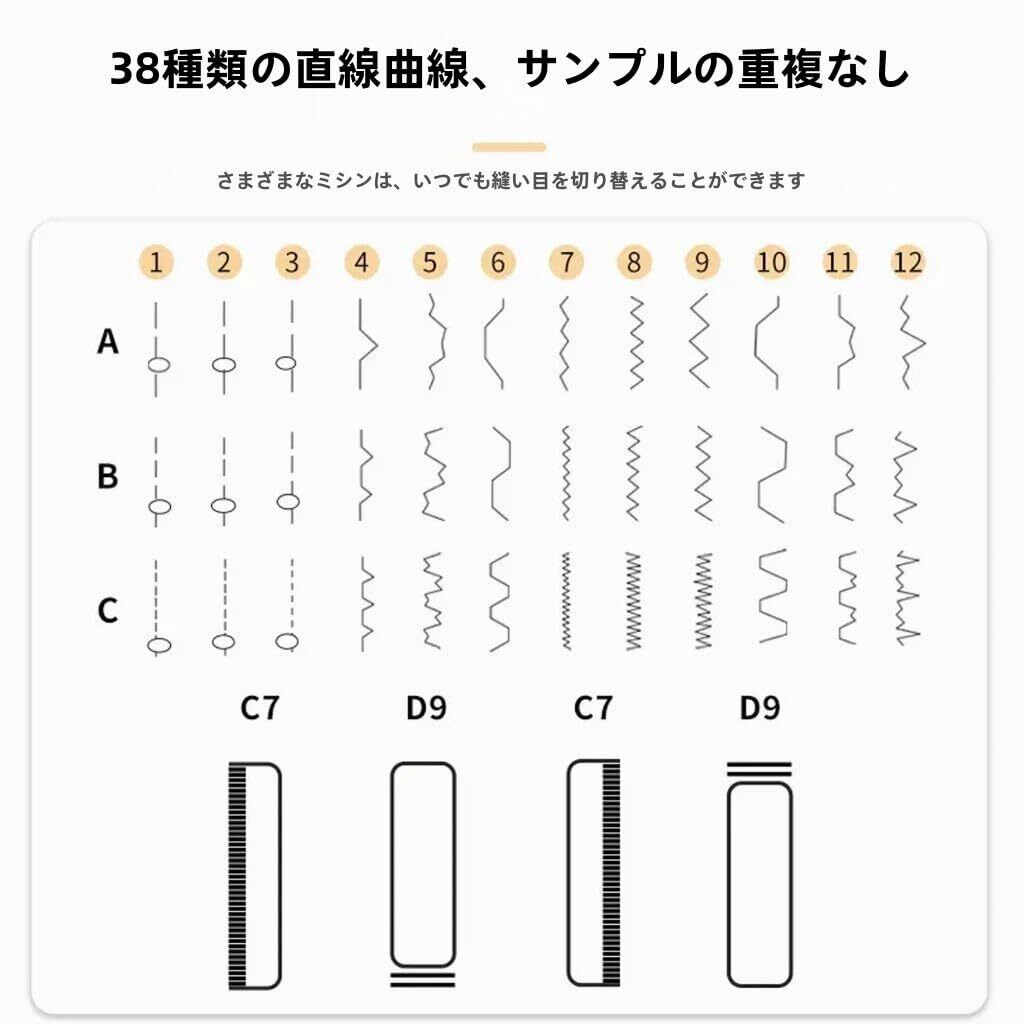 多彩なステッチオプション キルティング、ファッションデザイン、室内装飾などを含む幅広い縫製プロジェクトに対応する 38 種類の内蔵ステッチから選択できます。