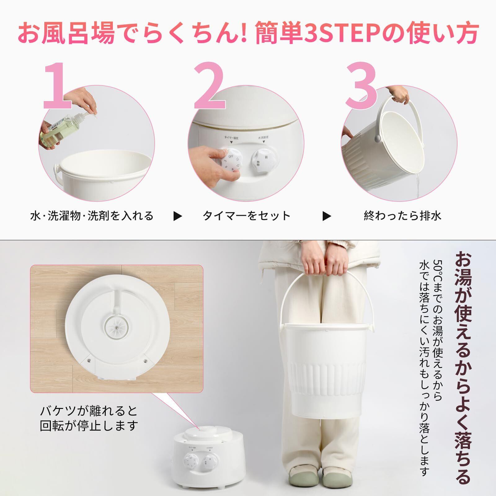 簡単操作:直感的に操作できるインターフェース。最大15分の洗濯時間と、洗浄力(弱・標準)の2種類から選べ、最大水量は10リットル。節水と省エネ設計で、環境にも経済的にも優れています。