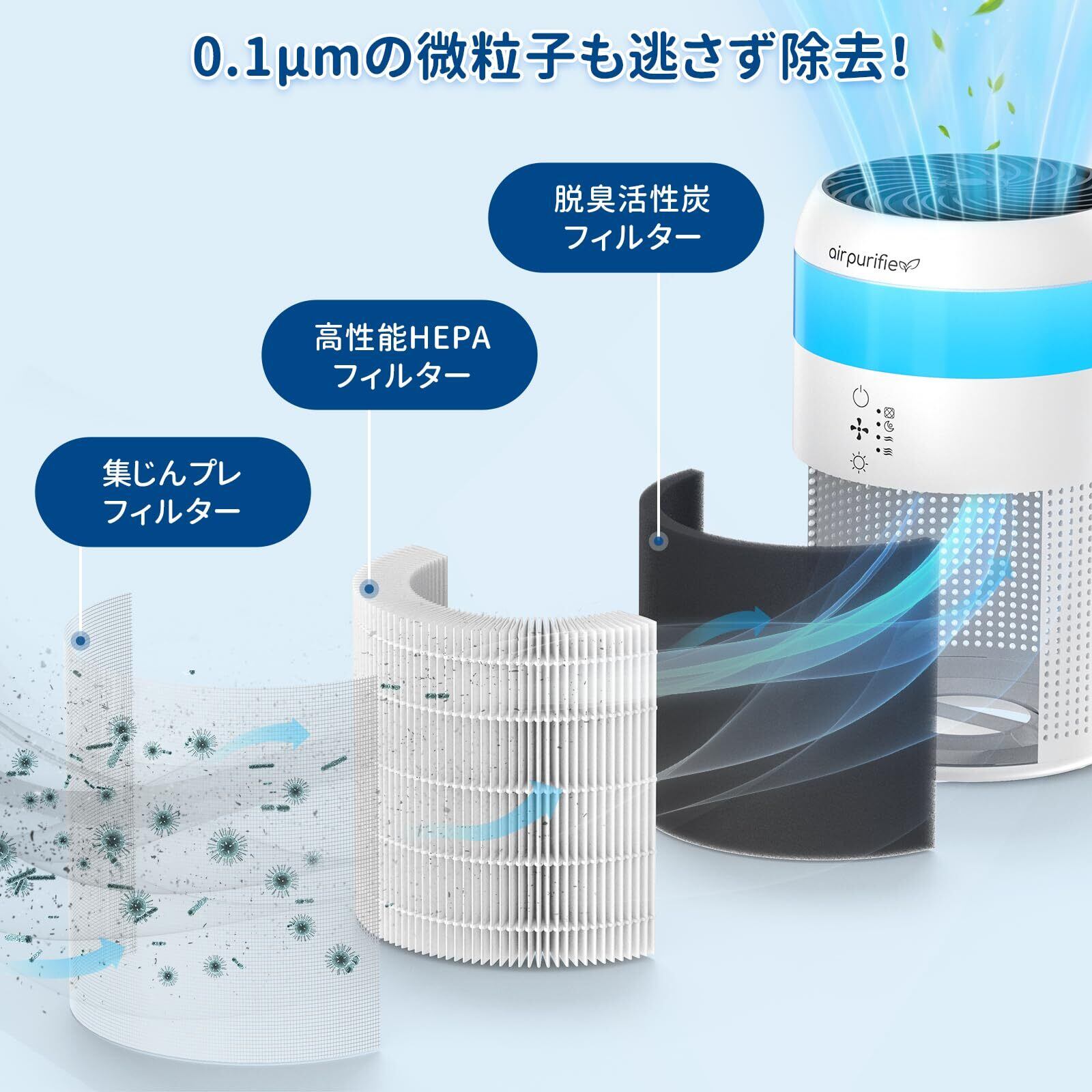 【多層高性能フィルターで強力浄化】二重活性炭フィルターが、カビ臭・ペット臭・タバコ臭などの生活臭をしっかり分解します。静電HEPAフィルターは99.95%以上の除去率で、花粉・ウイルス・細菌・ほこり・PM2.5など、0.1μmの微細粒子まで逃さずブロックします。さらにプレフィルターがペットの毛や大きなほこりをキャッチし、いつでもご家族もペットも快適に過ごせます。