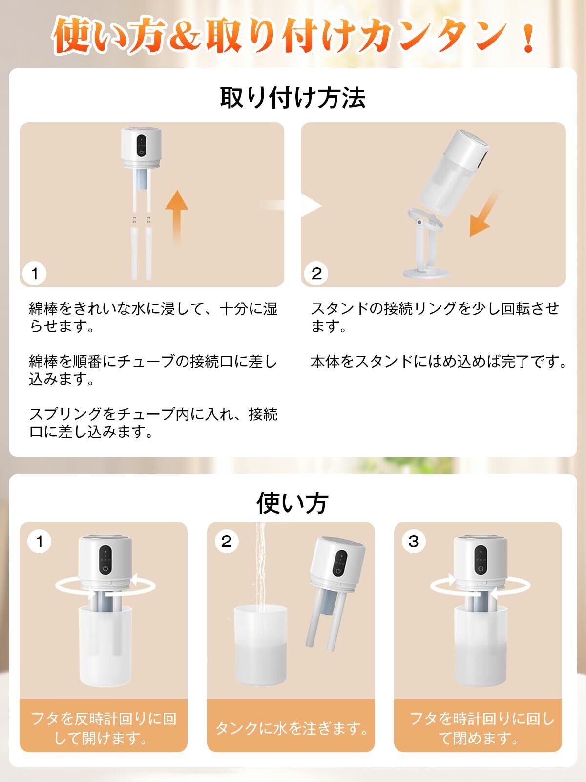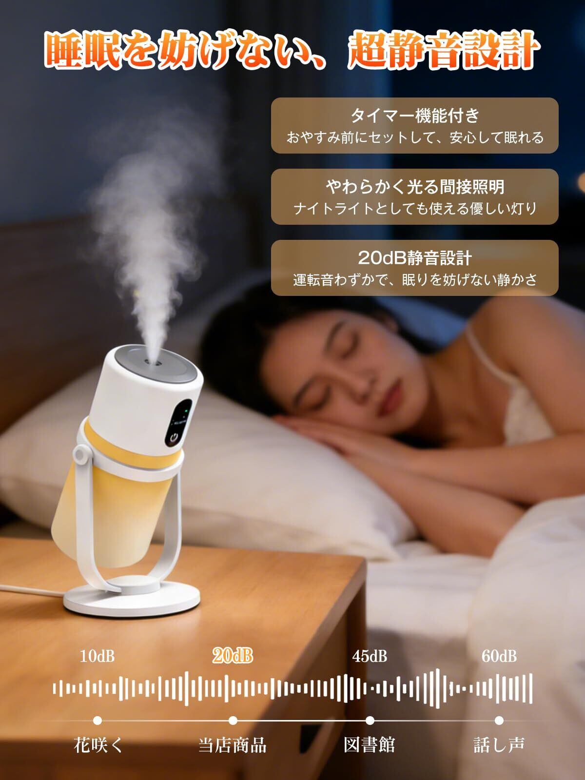 【図書館より静かな20dB以下運転&ナイトライト機能で睡眠・集中力を妨げない】「加湿器の音が気になって眠れない」「集中したい時にブーンという音が邪魔」そんなお悩みは本製品で解決できます。最大20dB以下の静穏運転は、時計の針の音よりも静か。就寝中はもちろん、在宅ワークでの重要なオンライン会議中、お子様の勉強時間、深く読み込みたい読書の時間も、その存在をほとんど意識させません。付属の暖色LEDナイトライトは、真夜中のトイレやお水を飲みに行く時、まぶしい室内灯をつける必要がなく、睡眠リズムを乱しません。従来の加湿器 小型モデルは機能が限られがちですが、本製品は「静粛性」と「安らぎの光」という二つの価値で、質の高い睡眠と集中できる空間づくりを強力にバックアップします。
