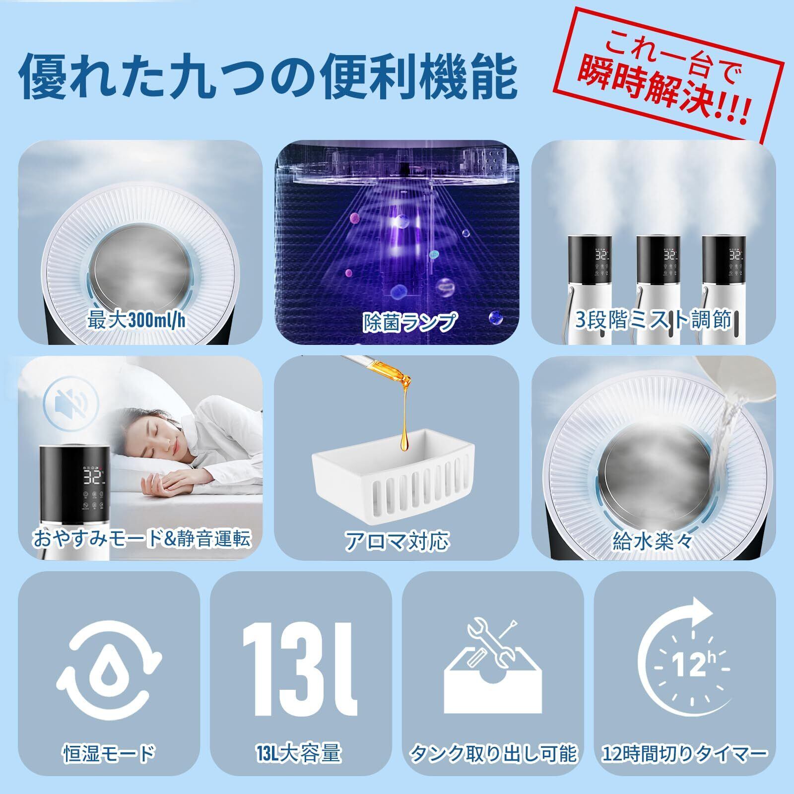 【三段階噴霧量調節&13L超大容量加湿器】噴霧量を弱・中・強の三段階に調節できる超音波加湿器で、冬の乾燥が厳しい時期には強め、春の訪れと共に控えめにと、季節や部屋の湿度に応じて柔軟に切り替えることが可能です。タンク容量はたっぷり13リットルあり、一度の満水で強運転でも一日中しっかり加湿できます。弱運転なら最大48時間連続使用が可能で、水の補充の手間を大幅に軽減します。ミスト量は最大300ml/hに達し、勢いよく噴出されるミストが部屋全体に素早く、均一に広がります。そのため、広いリビングやオフィス、一人暮らしのアパートまで、この大容量加湿器一台で十分に対応できます。秋冬の乾燥する季節には、乾燥対策としてだけでなく、風邪や花粉症の予防にも役立ちます。