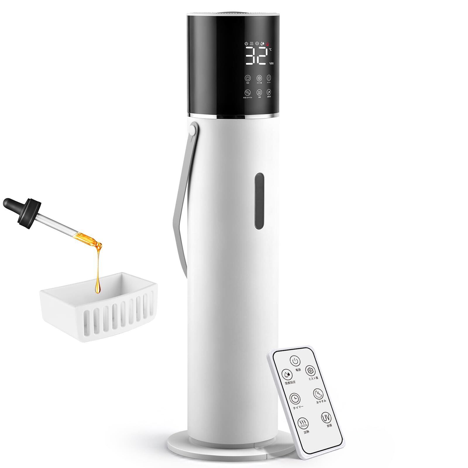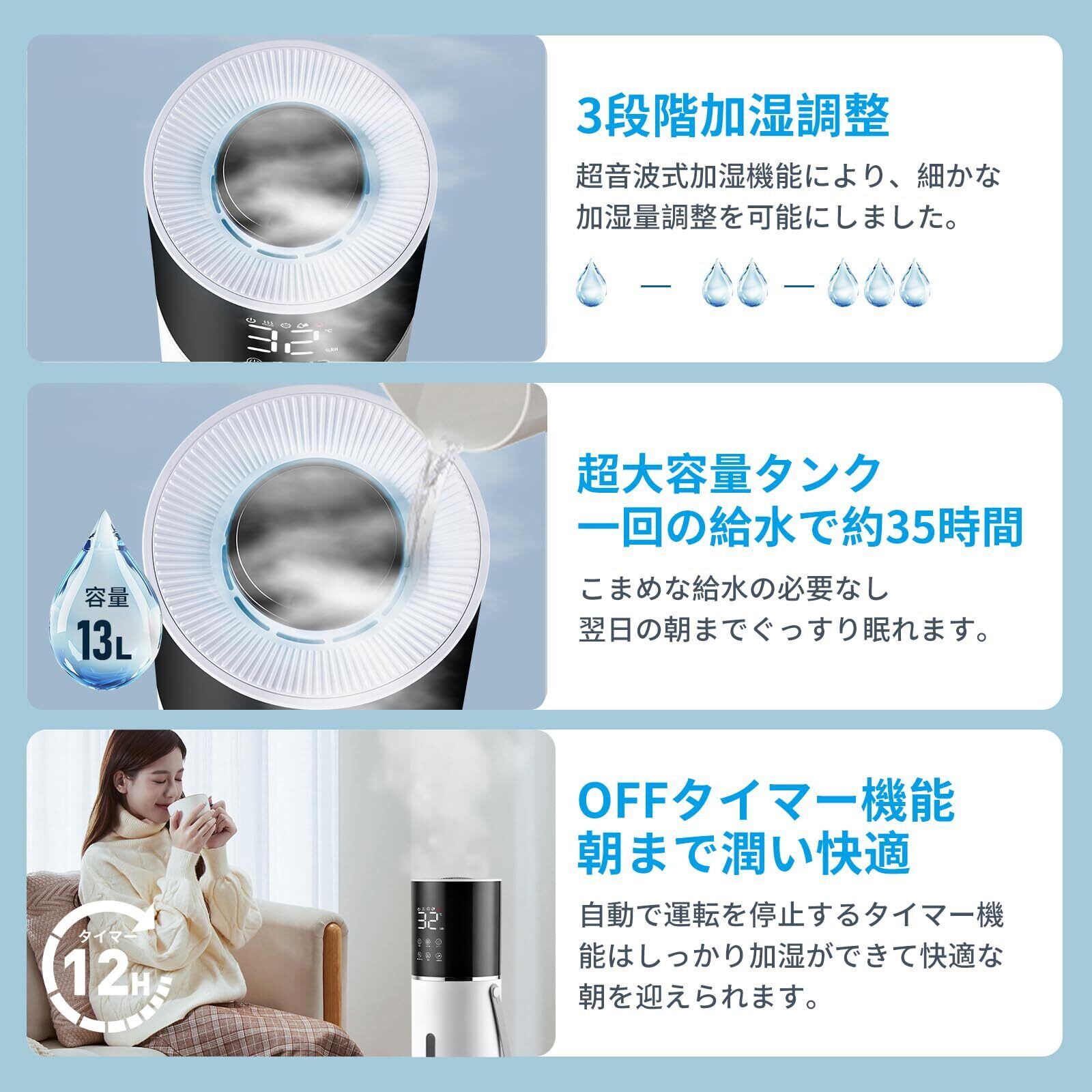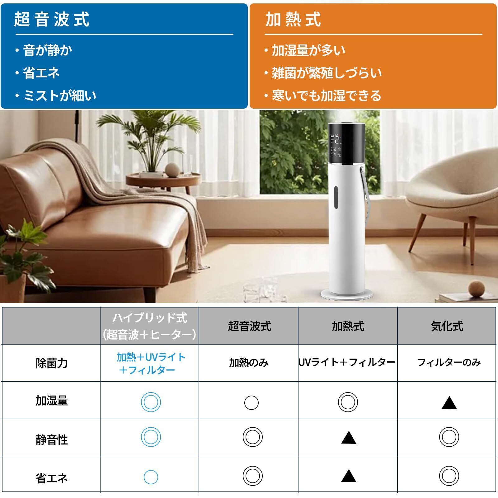 HZCYS【UV除菌ライト 大容量13L 加熱機能】EN62471光生物安全試験済|ISO17025認定ラボ検証|加湿器 タワー型 上から給水 超音波式 380ml/h 45畳 湿度センサー付き 3段階加湿調整 静音 空焚き防止機能 睡眠モード アロマ対応 大型加湿器 水漏れ防止 LED表示 乾燥対策 お手入れ簡単 持ち運び便利 リビング 家庭 寝室 オフィス 学校
