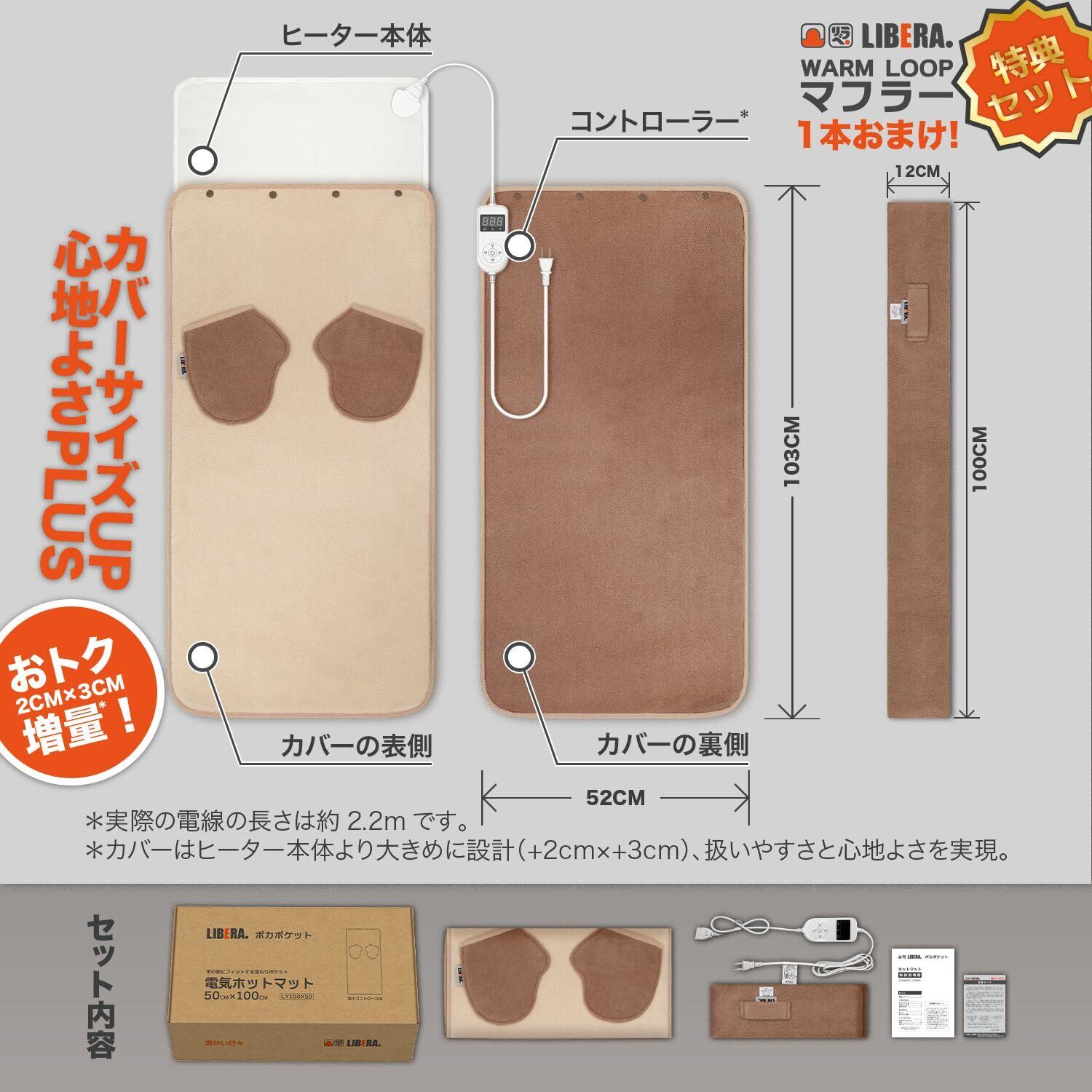 【特典マフラー付き】LIBERA. ミニ電気マット ハンドウォーマーブランケット 洗練デザイン ポカポケット設計 100×50cm 一人用電気毛布 速暖・省エネ コンパクト 洗濯可 5段階温度調節(40〜60℃)タイマー・過熱防止(アーモンドミルク)