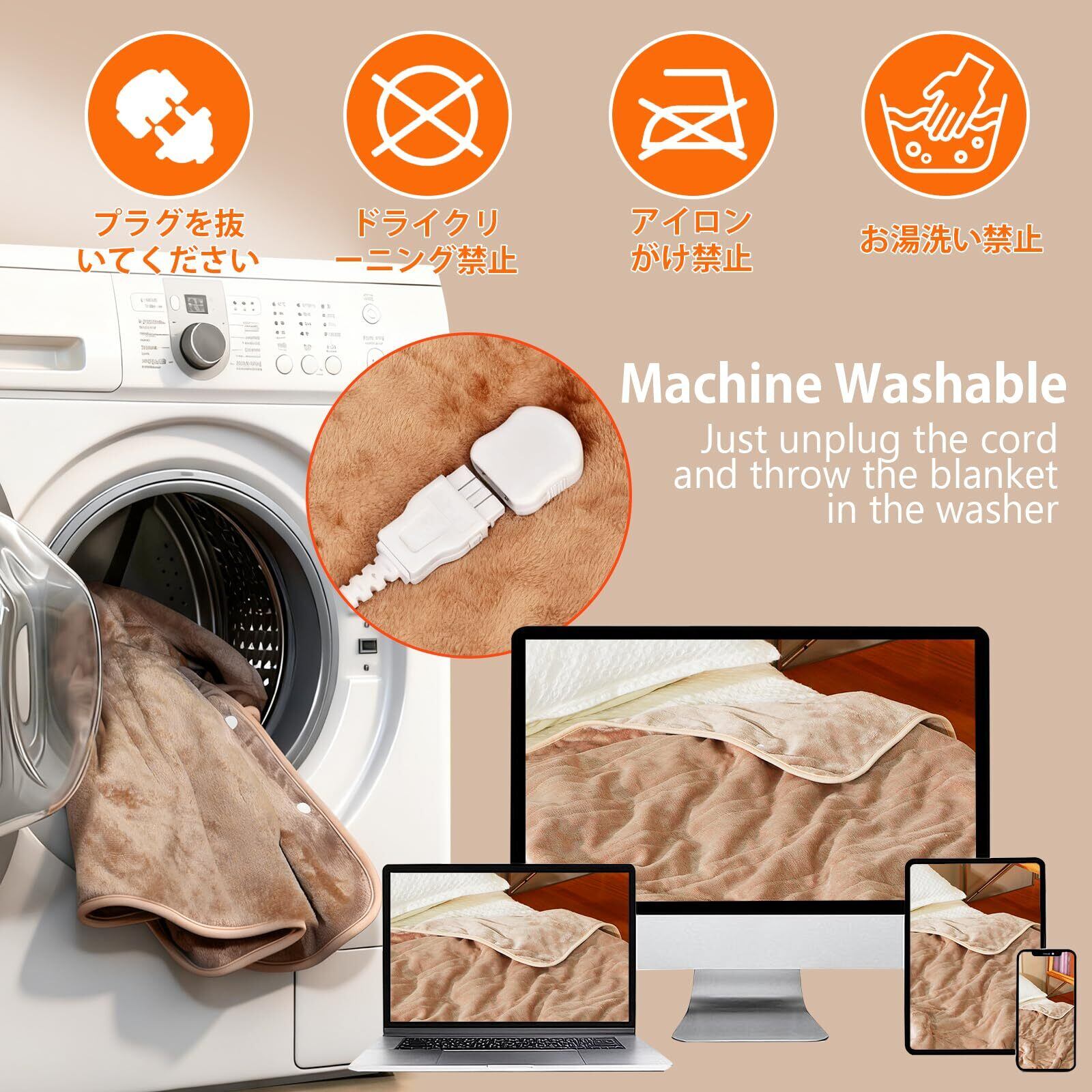 【洗濯機対応】電気毛布 ダブルのリモコンと電源コードは完全に取り外し可能で、華氏104度(約40℃)の洗濯機洗浄に対応。電気毛布を清潔に保ち、新品同様の状態を維持できます。電気毛布の柔らかなフリース素材は耐久性に優れ、長く続くさわやかな肌触り(洗濯前に必ずコントローラーを外してください)。