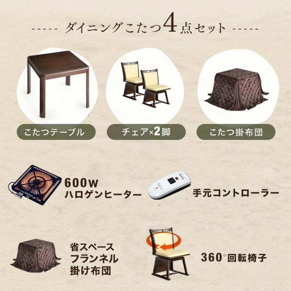 【人気商品】タンスのゲン ダイニングこたつ 4点セット 2人用 正方形 【速暖2秒!600Wハロゲンヒーター】 手元コントローラー 【こたつ本体+掛布団+チェア2台】 80×80cm 回転椅子 敬老の日 68140073 (82893)