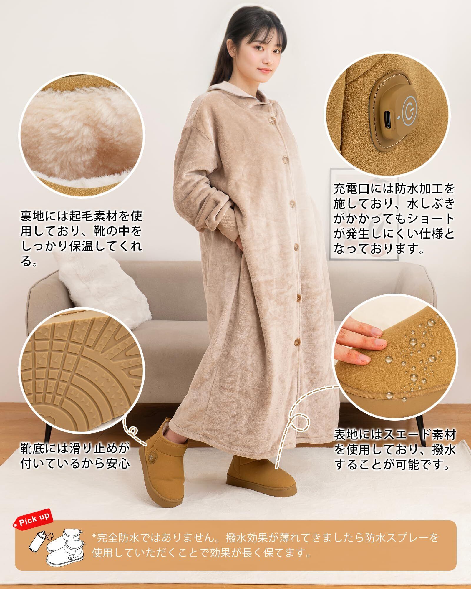 【柔らかく快適な履き心地&室内&アウトドア2WAY】表地には撥水加工が施されたスエード調生地、裏地には柔らかな裏起毛を採用。歩行音を抑え、軽量で足全体を優しく包み込みます。室内履きとして快適な履き心地を提供するスリッパで、さらに、スノーブーツ仕様でアウトドアにも最適です。バッテリーは靴底に内蔵され、従来の甲部分に比べ、靴底に配置することで足への負担を大幅に軽減しています。4000mAh容量バッテリーを内蔵し、最大6時間の連続使用が可能です。