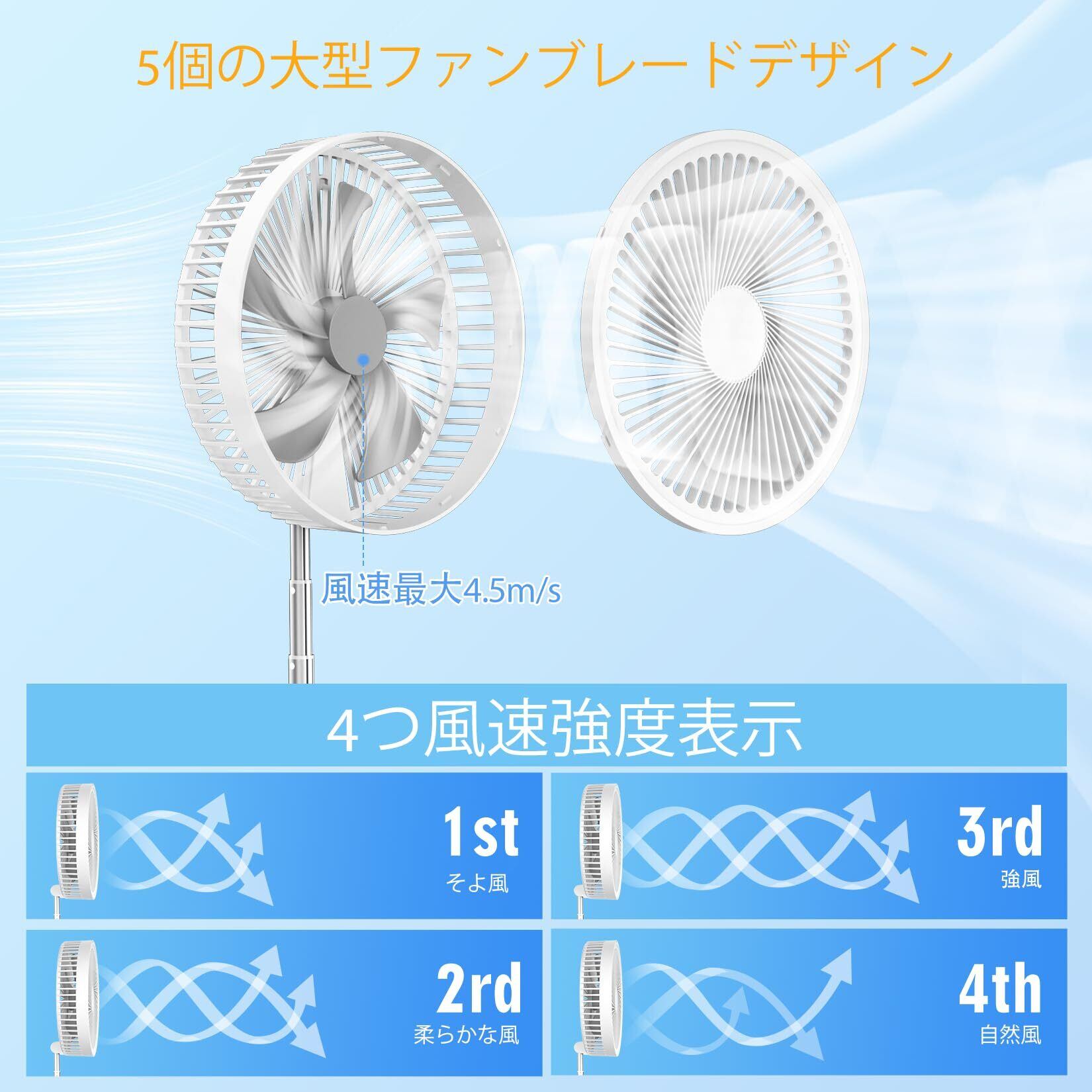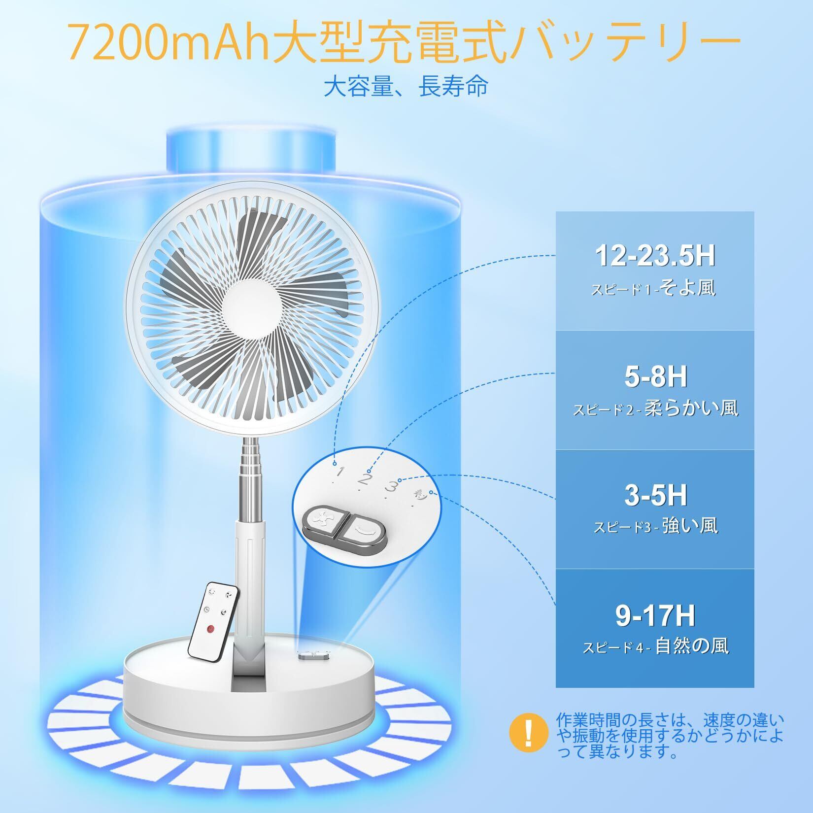 ポータブル折りたたみ式充電式首振り扇風機 ホワイト、7200mAhバッテリー駆動USB、約4時間でフル充電、4スピード、動作時間は速度に応じて5.5~23.5時間、便携式 高さ調節可能な 卓上扇風機 静音、リビング扇風機、寝室、オフィス、キャンプ、旅行用、(リモコン付き)