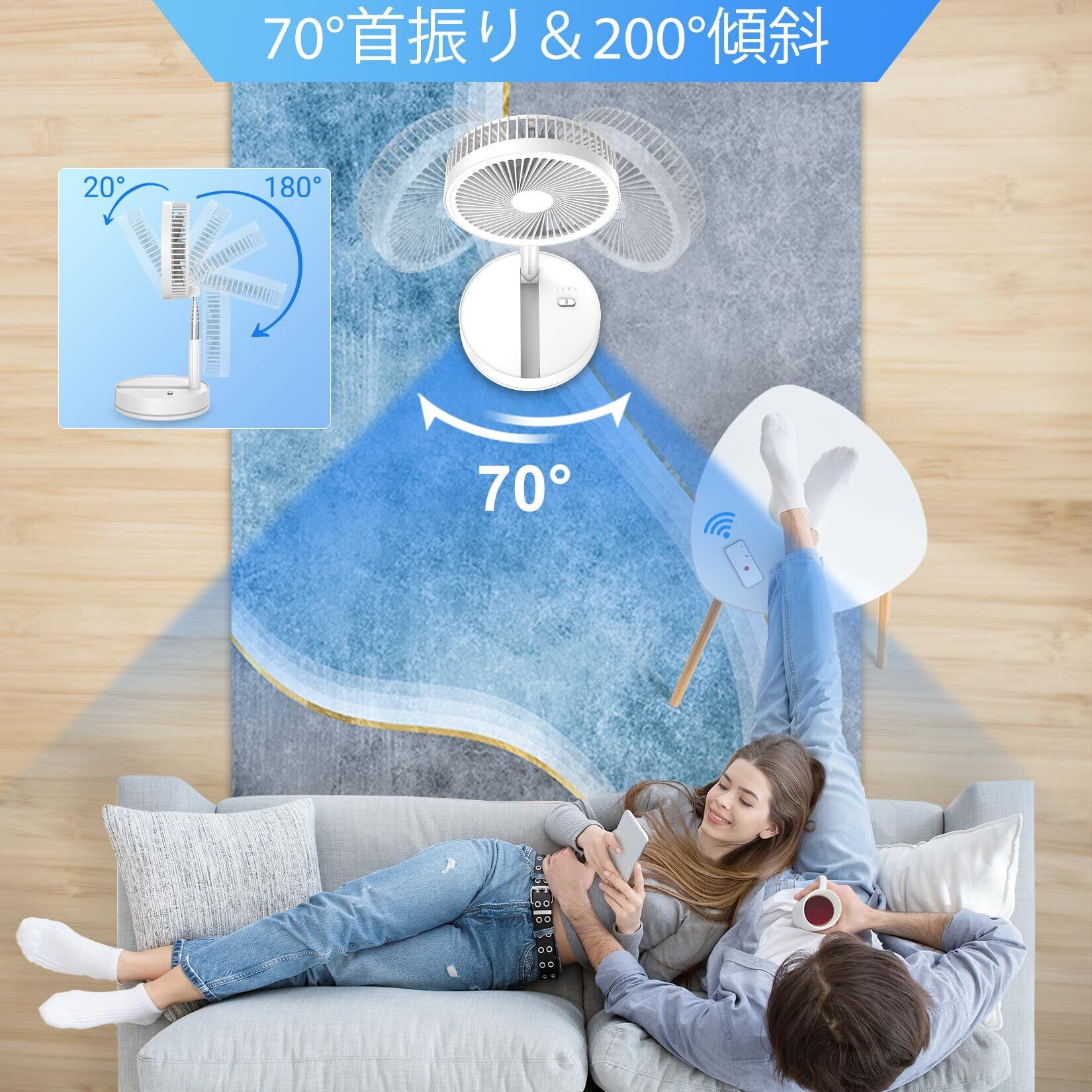 【数量限定】ポータブル折りたたみ式充電式首振り扇風機 ホワイト、7200mAhバッテリー駆動USB、約4時間でフル充電、4スピード、動作時間は速度に応じて5.5~23.5時間、便携式 高さ調節可能な 卓上扇風機 静音、リビング扇風機、寝室、オフィス、キャンプ、旅行用、(リモコン付き)