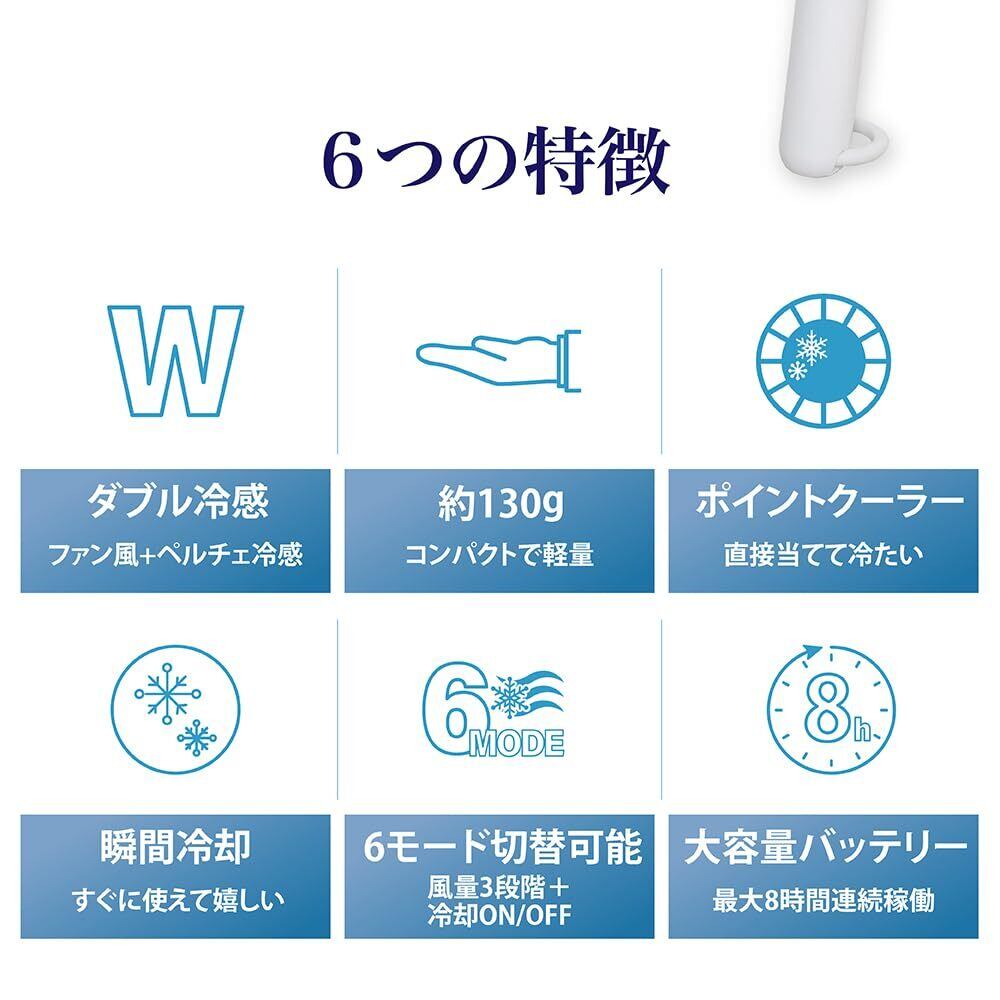 外気温より-17℃ ペルチェ冷却とは冷却プレートで体温調節が瞬時に実感できる冷却効果のことです。コンパクトだからどこでも持ち運べて快適・便利 軽量約135gで本体が軽いので気軽に持ち運べ、スタンドを使えば机の上で使用したりカバンにさげて使用することも可能です。お好みで調節!ファン機能6モード