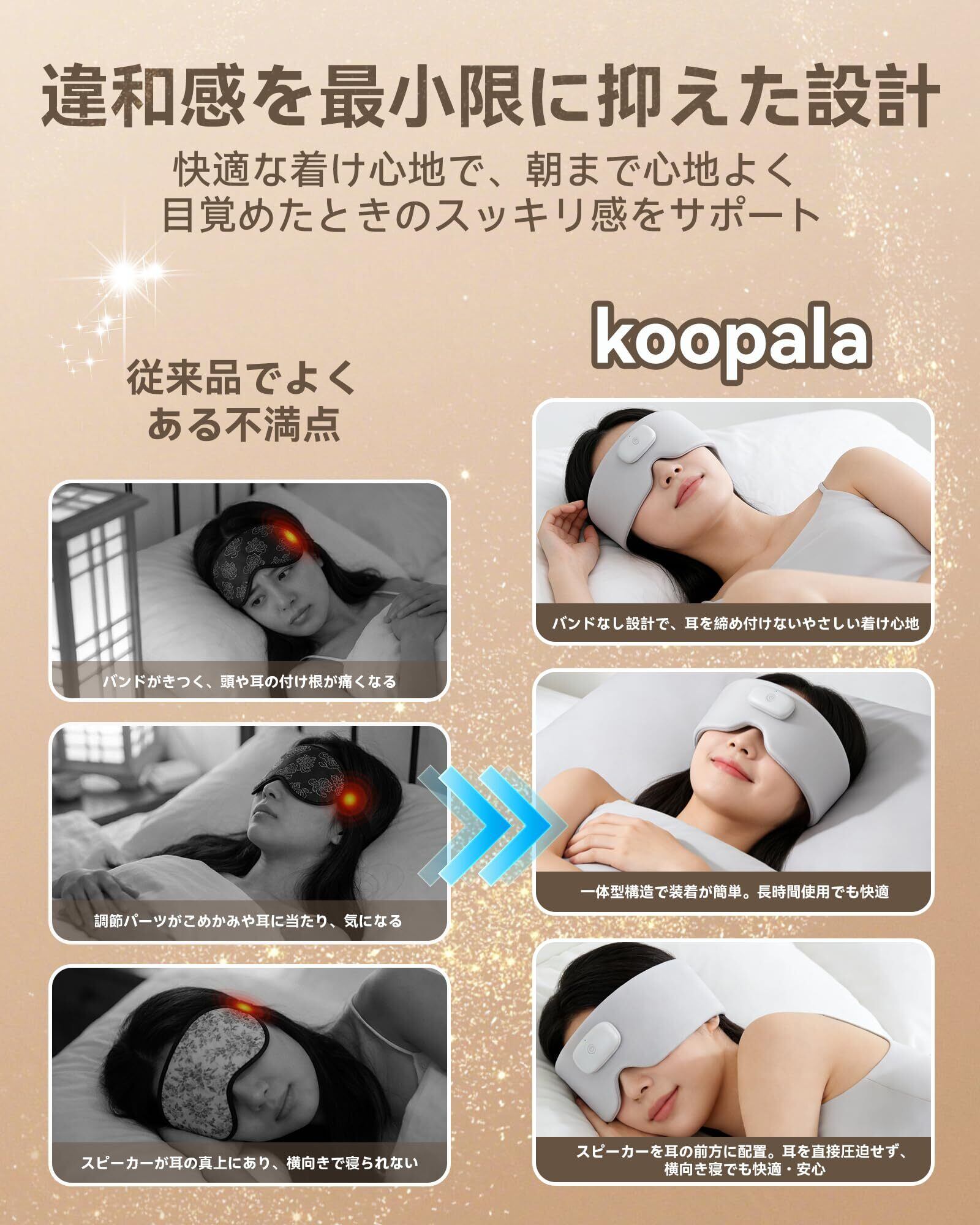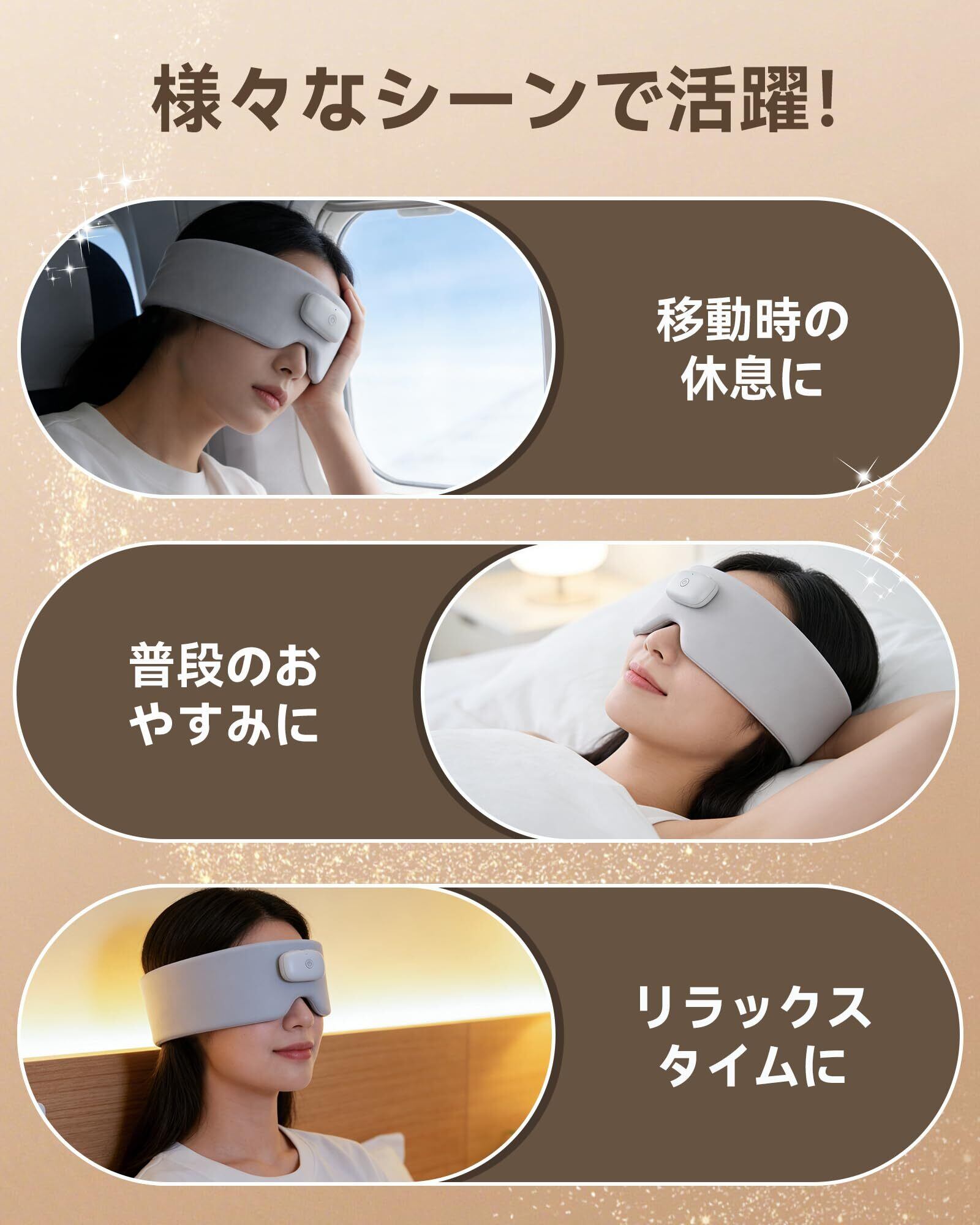 人間工学に基づく3D立体構造・完全遮光&コードレス仕様。 目元のカーブに沿う3D立体デザインで光をしっかり遮断し、明るい環境でも深い暗さを保ちます。コードレス・USB充電式なので、寝返りをうっても邪魔にならず、どこでも自由に使えます。また、操作時には分かりやすい日本語の音声ガイドを採用し、初めての方でも迷わず設定できます。