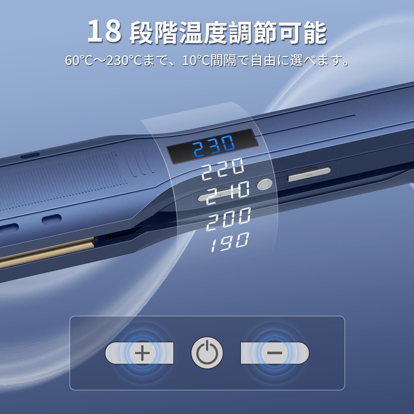 ️【急速加熱・18段階温度調整】こちらのヘアアイロン のプレート表面はセラミックコーティングが熱伝導に優れ、抜群の熱伝導率を持ち、予熱時間を30秒まで短縮します。従来のPTCヒーターと比ベて、20%~30%節電を実現します。 忙しい朝や急な外出時に、素早く髪を直してスタイリング。また、ストレートアイロンは18段階の温度調節(60℃~230℃)があり、他の社のアイロン暖房効率が1.5倍アップアップします。 細髪から硬い髪まで使えるので、髪の状態や髪質に合わせて、適度に調節できます。 ご注意: 製品に表示されている数字が点滅している場合は、温度が上昇していることです。 点滅が止まり、設定温度に達するまで待ってから使用を開始してください。