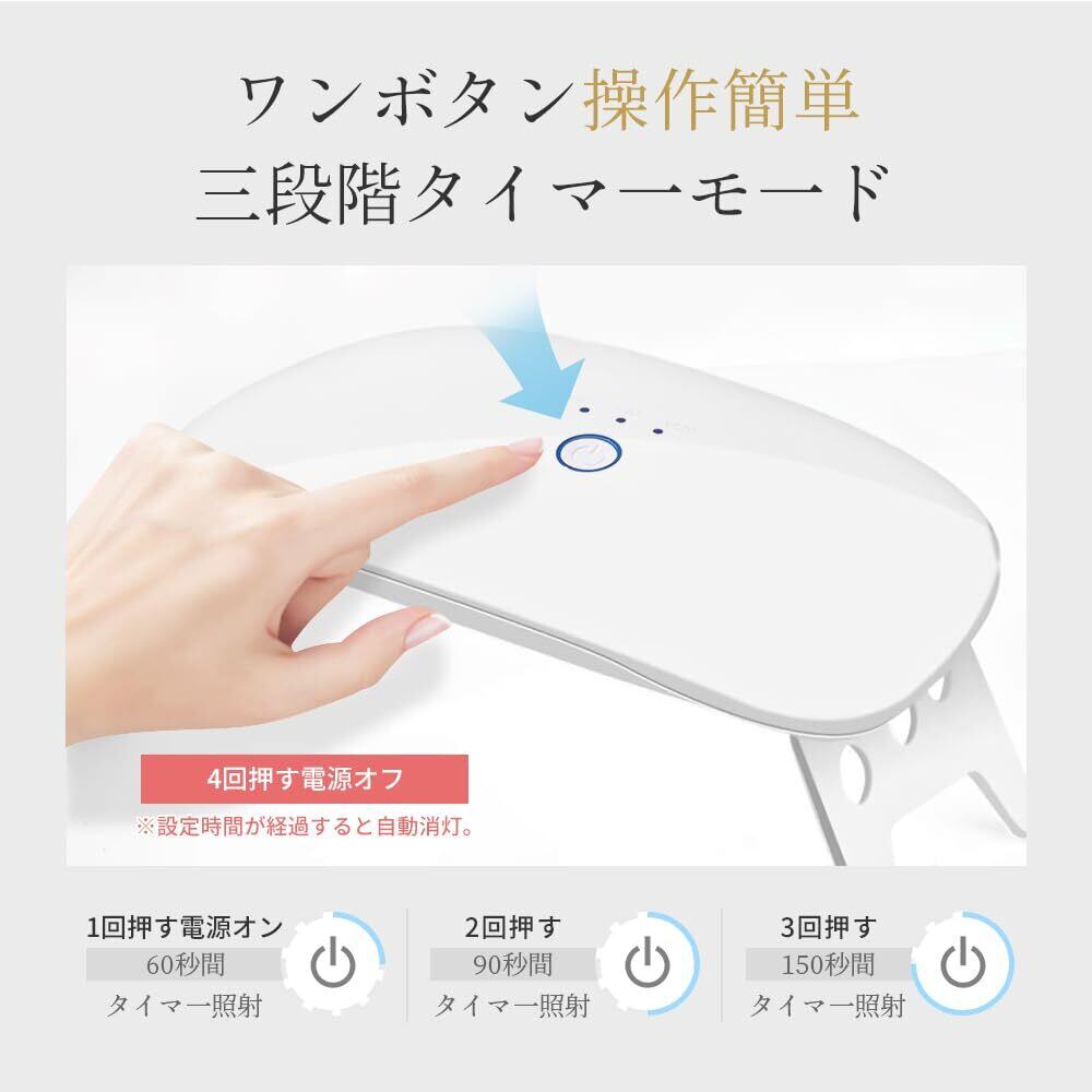 【ワンボタン操作簡単】三段階タイマーモード、ボタンを押すだけで簡単に切り替えます。マニキュアの種類に応じて硬化時間を自由に選択でき、1回押すと60秒、2回押すと90秒、3回押すと150秒、4回押すと電源がオフになります。人感センサー機能付き、手の出し入れだけでライトが自動的に点灯・消灯します。