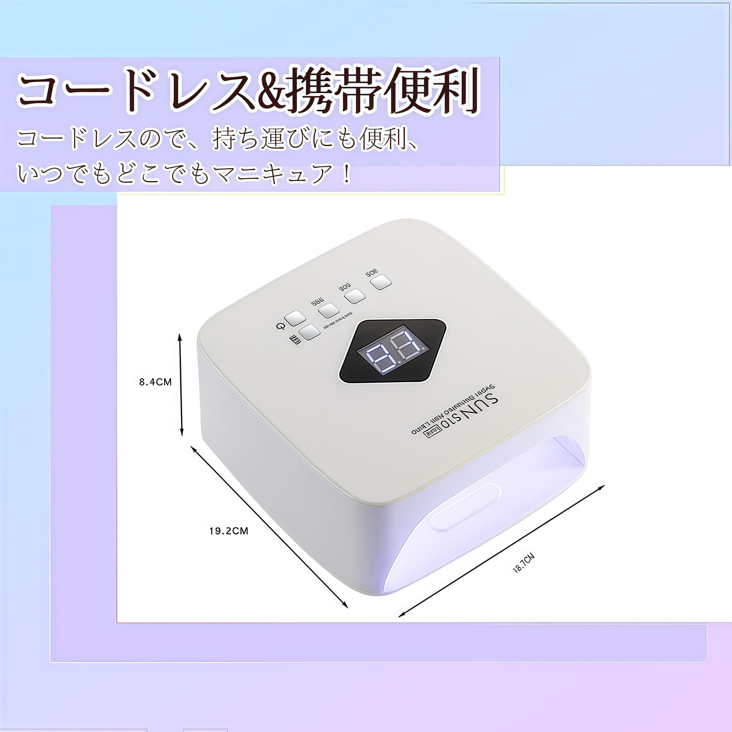 【充電式コードレスLEDネイルライト】ネイルライトが120Wのハイパワー高速硬化可能です。充電式UVネイル ライトは大容量の9600mAhバッテリー内蔵の充電タイプです。コードレスだから設置場所を問わず、どこでもご使用可能!約2時間のフル充電で、最大6-8時間使用できる。 いつでもどこでもワイヤレスで使用でき、とても便利です。 女性の贈り物にぴったりです。