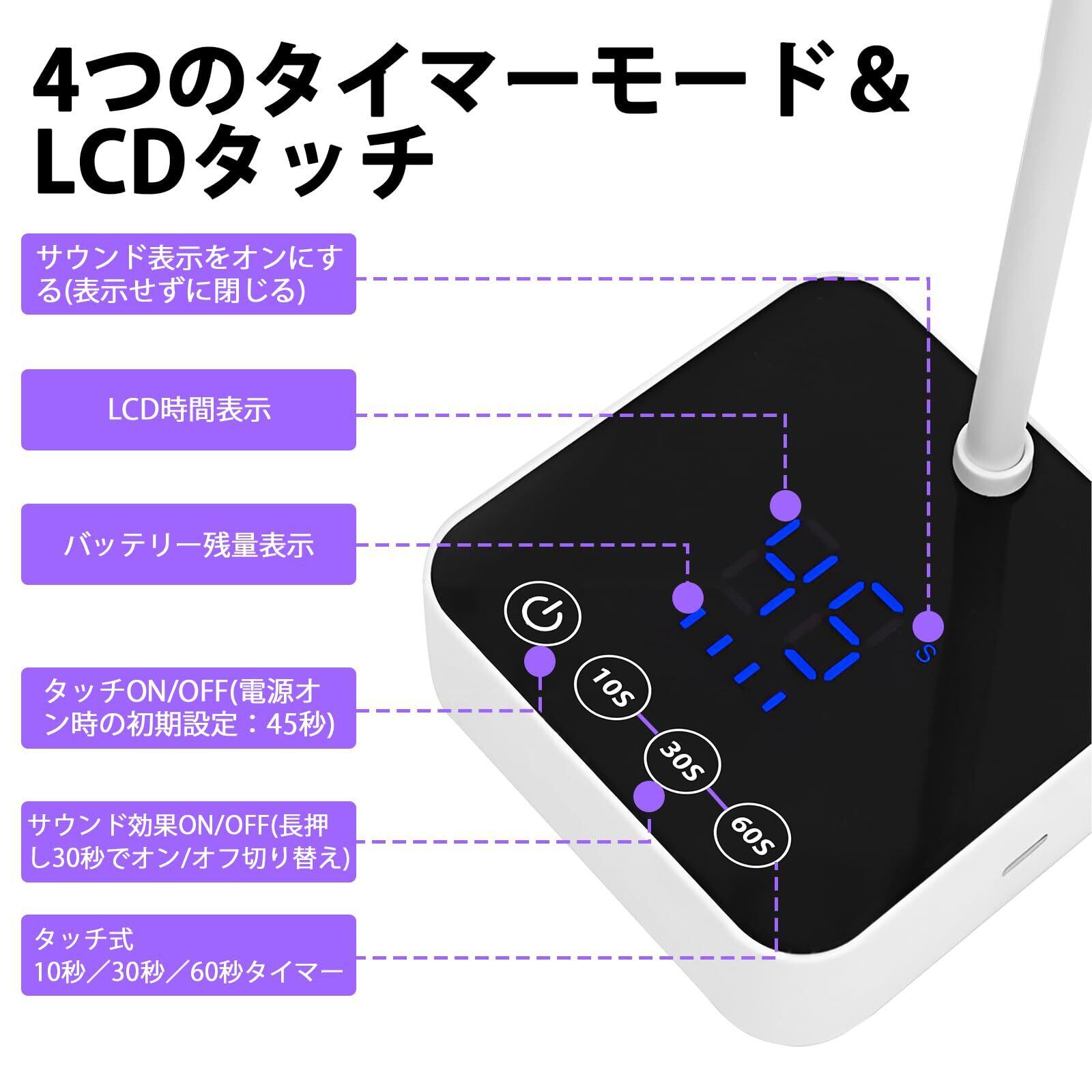 自動感知&4段階タイマー設定:グースネック型ネイルライト スタンドは、LCDタイマー画面を備えており、10秒/30秒/60秒の3つのタイマー設定と、デフォルトの45秒感知モードを搭載しています。電源ボタンに触れると、自動的に45秒の感知カウントダウンモードに入ります。(ライトヘッドから5cm離れると感知しなくなり、再使用時には45秒カウントダウンがリセットされます。)