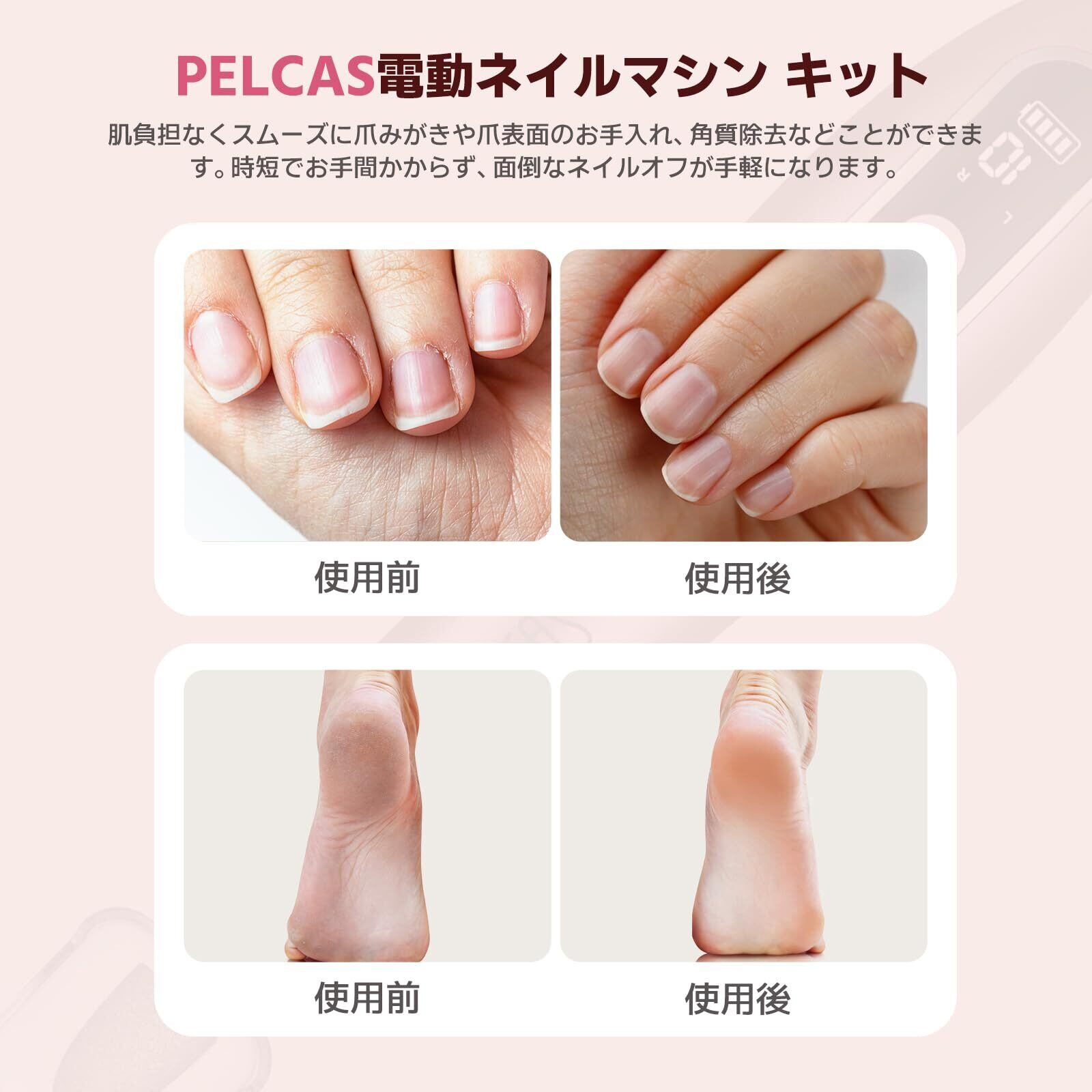 【オールインワン、10in 1多機能ネイルケアセット】付属品:ビット*10 サンドングバンド*60#市販品は10個だけ、掃除ブラシ*1#市販品はない(取り外せるネイルビットは10個付属されております。) 爪の形と長さを整え、甘皮処理、爪表面を磨きなどジェルを塗るまでの下準備は全部PELCAS電動ネイルマシン一台にお任せください。人力で爪削り作業より、お手数もご時間も省くことができます。ジェルネイルを乗せる前に楽々に爪を最適な状態をつくられ、作業の効率がアップします。