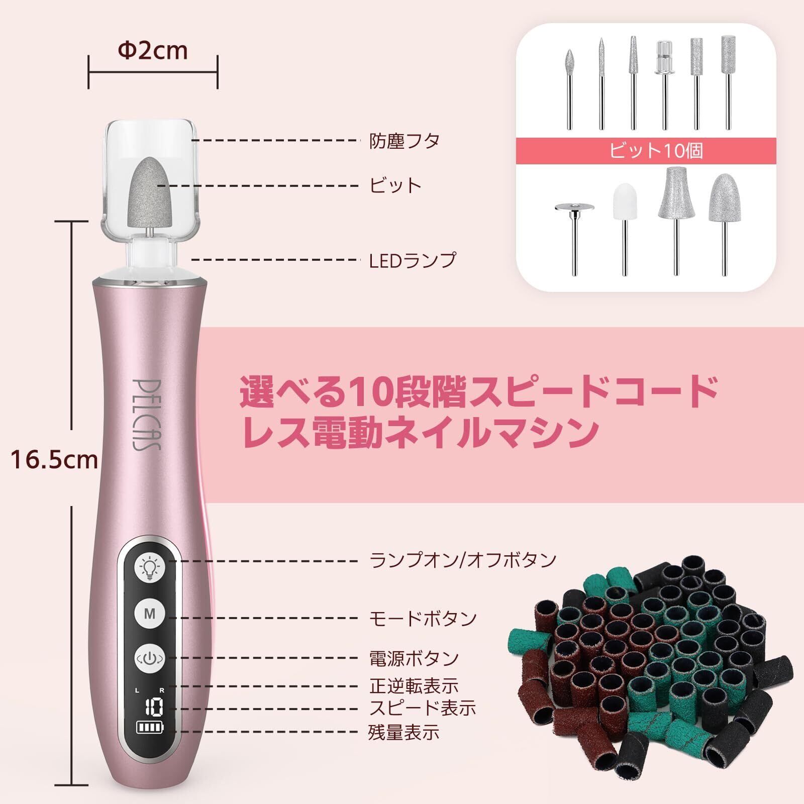 PELCAS電動ネイルマシン 10個のビット ネイルマシーン ジェルネイル オフ キットネイルケアセット 爪磨き 爪やすり 甘皮処理 甘皮ケア 正逆回転 10段階変速 ピンク