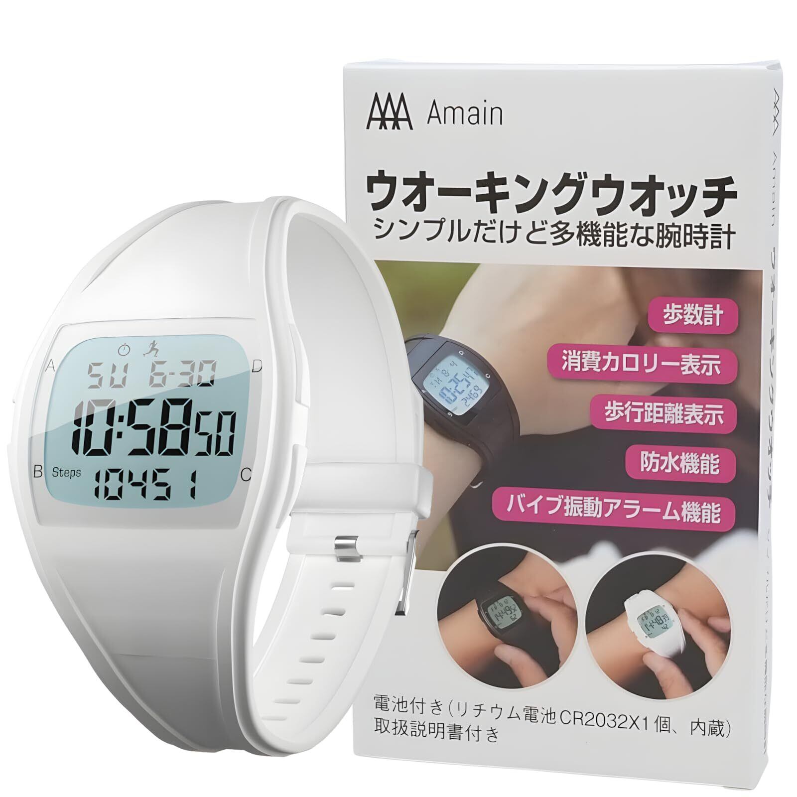 【日本国内試験済・誤差3%未満】歩数計付き腕時計 シニア向け ウォーキングウオッチ 振動アラーム 目覚まし時計 防水機能 Amain (オールホワイト)
