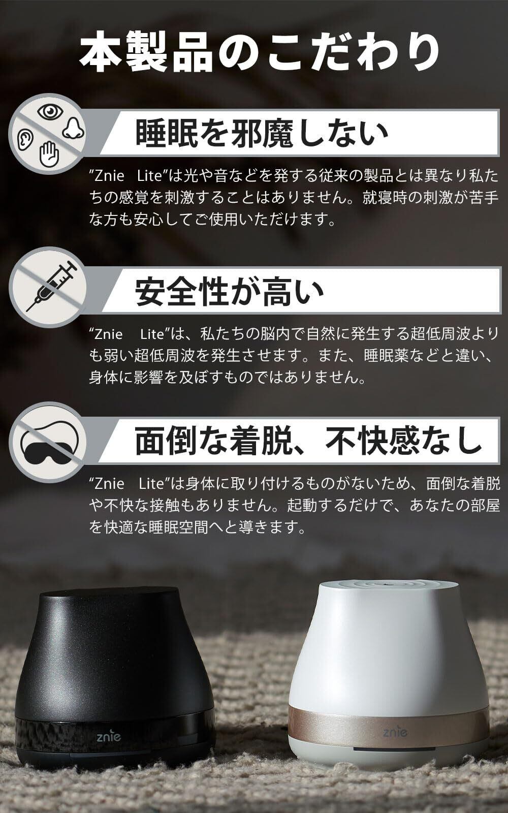 【感覚刺激がないから、睡眠を邪魔しない】「音や香り、光などが邪魔で逆に眠れない」と言ったことがありません。そのため、家族やパートナーと同じ部屋で寝ている方にもおすすめです。