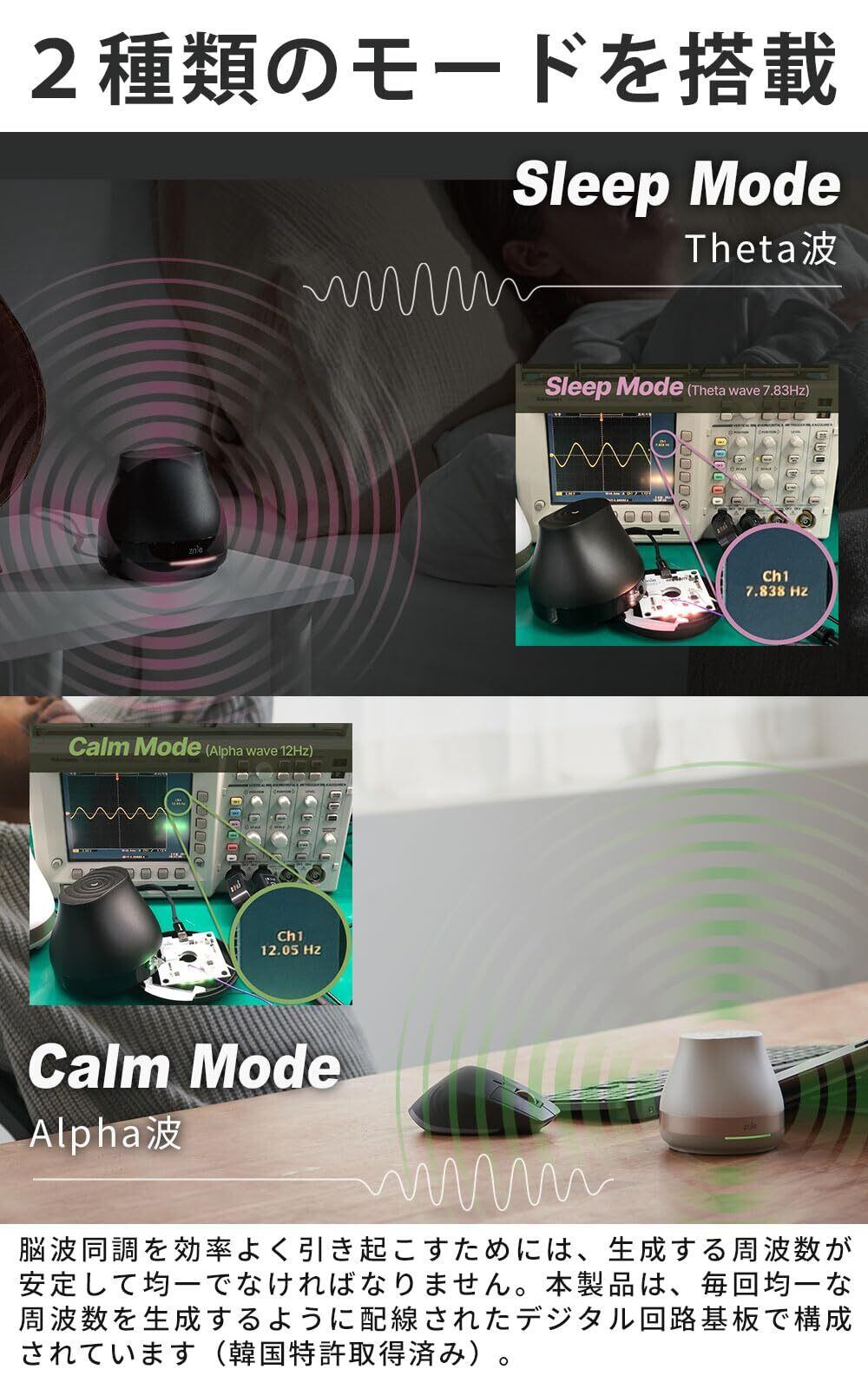 【睡眠に不満を抱くあなたに】脳波同調を利用した最新アプローチのスリープケアデバイス。脳波に似た超低周波(ELF)を発生させることで快適な睡眠空間の構築をサポートします。