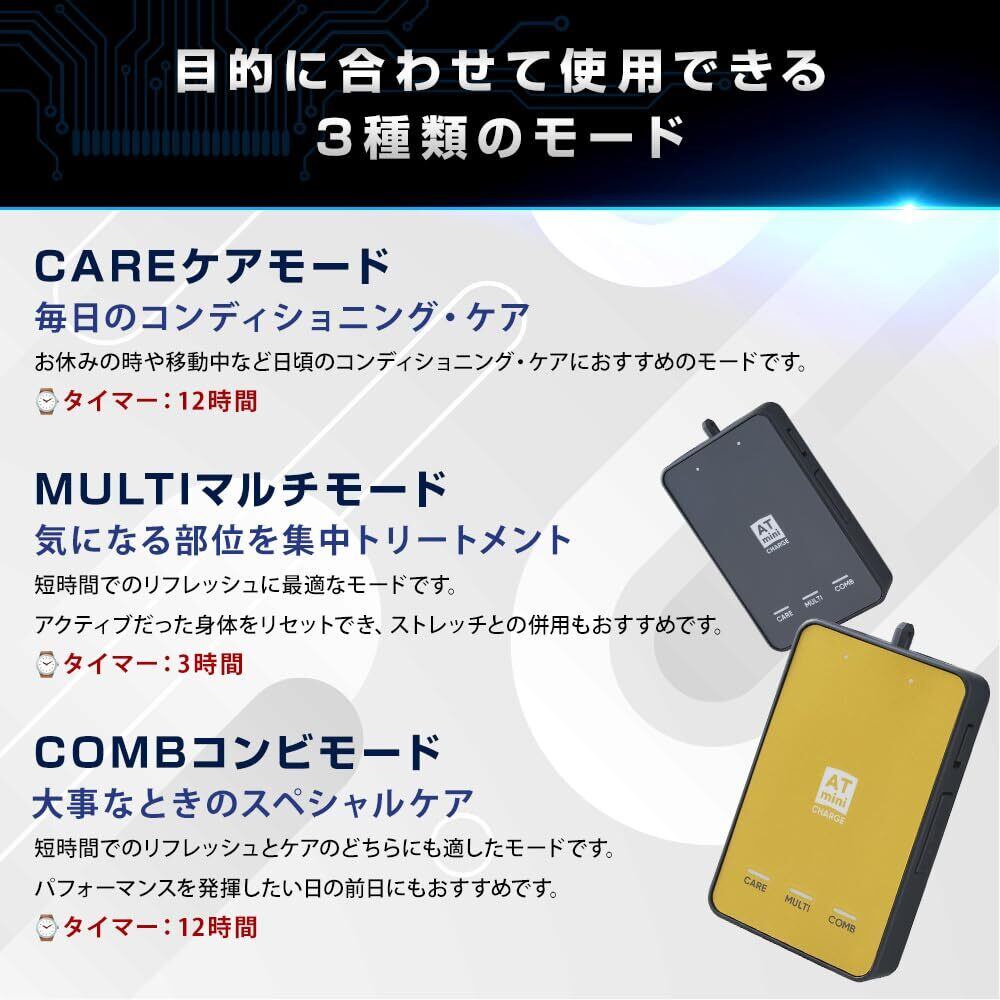 【3種類のモードで効果的に】CARE[ケアモード]:12時間タイマー お休みの時や移動中など日々のコンディショニング・ケアにおすすめのモードです。MULTI[マルチモード]:3時間タイマー 短時間でのリフレッシュに最適なモードです。COMB[コンビモード]:12時間モード 短時間でのリフレッシュとケアのどちらにも適したモードです。パフォーマンスを発揮したい日の前日にもおすすめです。