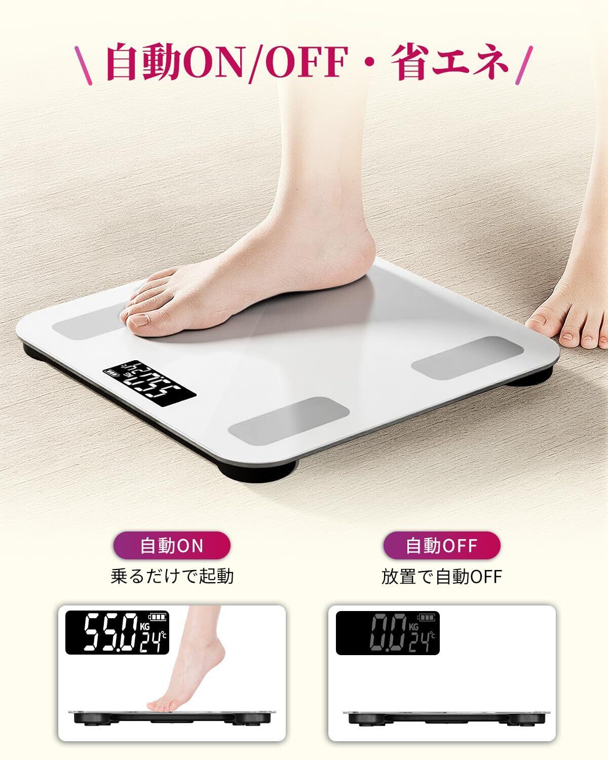 【超薄型デザイン&スマート連動で日常を快適に】厚さ2.1cmのスリムボディが収納ストレスを解消。Bluetooth接続でシームレス同期、測定データは自動でアプリに連携。過去のデータを比較分析できるため、効果的な健康プランが作成可能。浴室のわずかな隙間にも収納できるコンパクト設計で、毎日の測定が習慣化します。