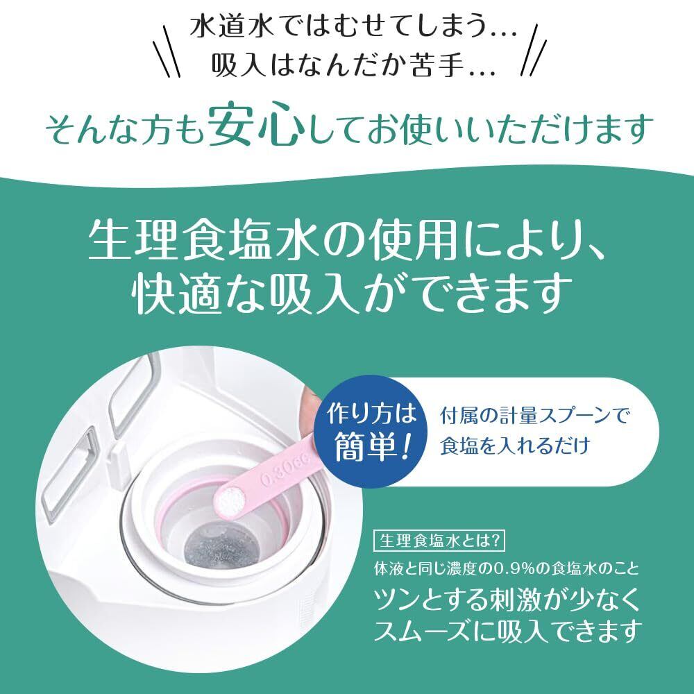 【生理食塩水で快適に吸入】体液と同じ濃度の生理食塩水をお使いいただくことでむせにくく、スムーズに吸入することができます。食塩水の作り方は適量の水に付属の計量スプーンすりきり1杯の食塩を入れるだけ。