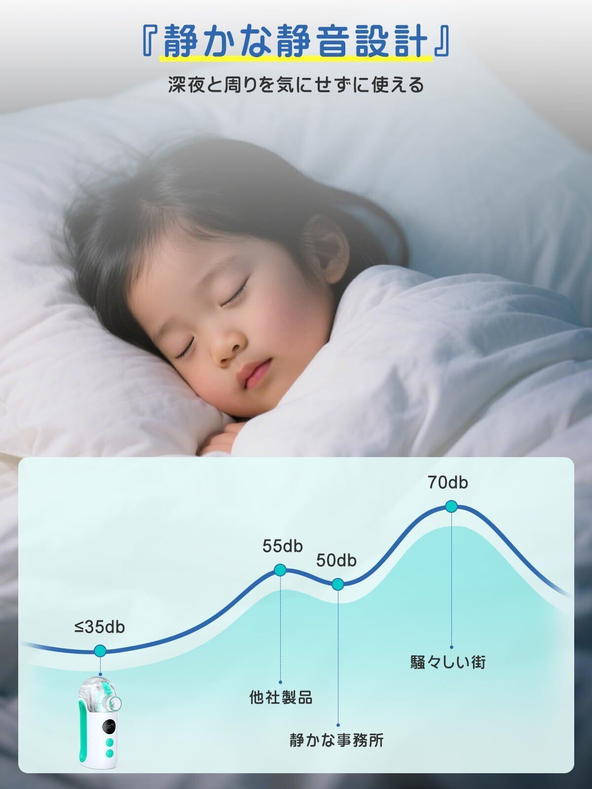 【静音設計・家族全員に快適】コンプレッサー式と異なり、超音波メッシュ方式を採用しているため、運転音は非常に静か。赤ちゃんや小さなお子様も安心して使用でき、夜間でも周囲を気にせず利用可能です。大人用マスク、子供用マスク、マウスピースの3種類を付属し、ご家族全員のニーズに対応します。