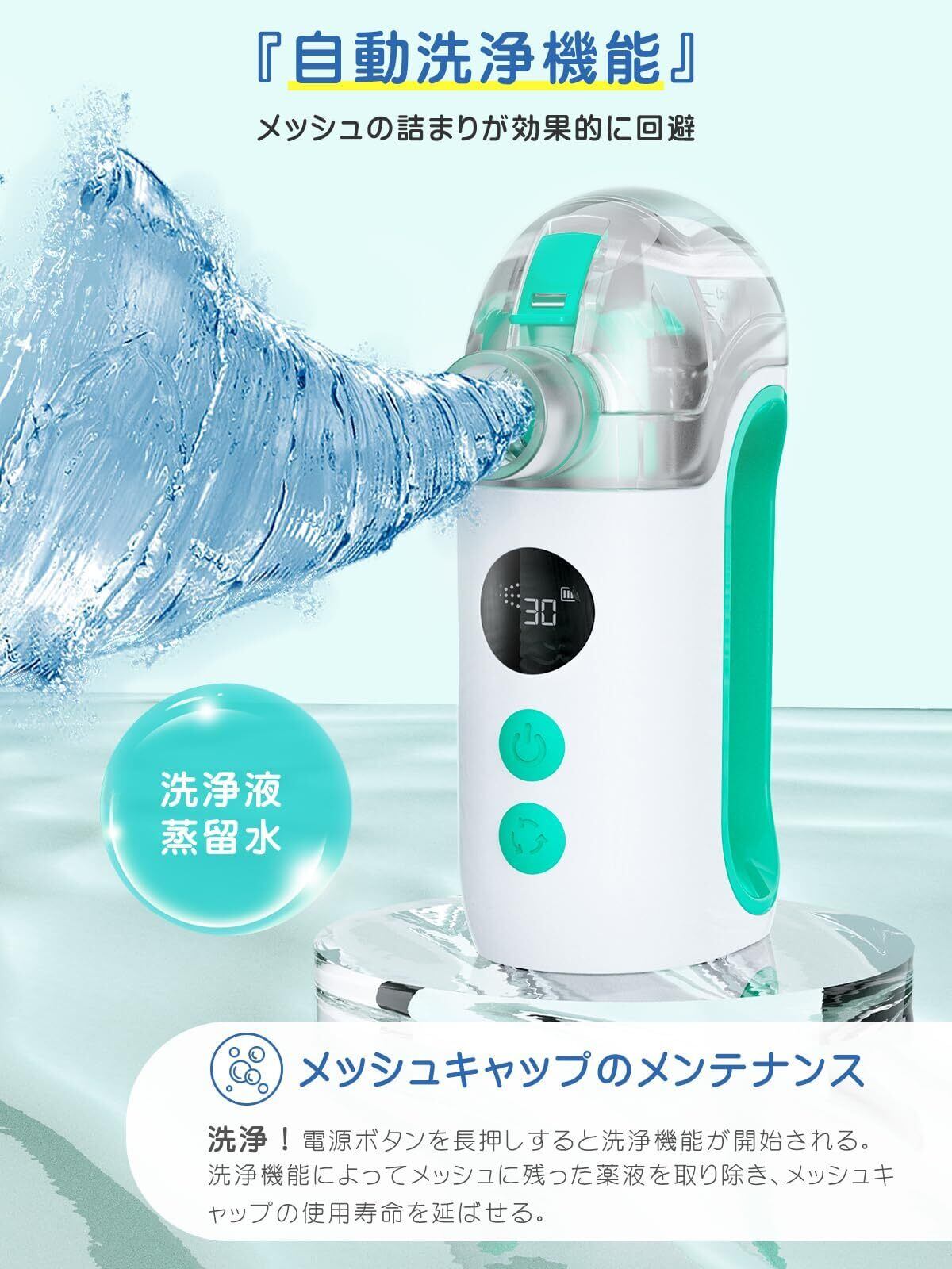 【自動洗浄機能でメッシュ詰まりを予防】使用後に薬液カップへ蒸留水たは精製水を入れ、電源ボタンを長押しするだけで自動洗浄モードが起動。メッシュ部分に残った薬液を効果的に洗い流し、詰まりを防止します。清潔な状態を長期間維持でき、いつでも安定した噴霧性能を発揮します。