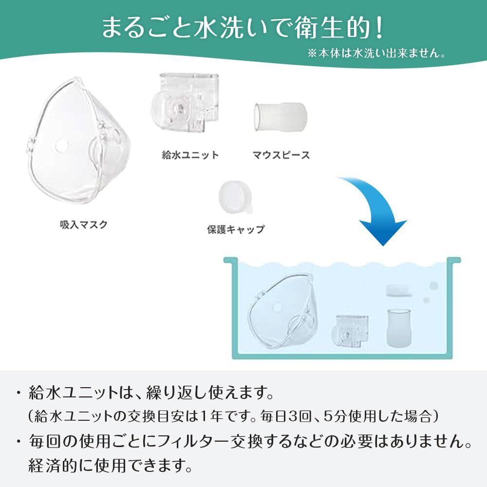【生理食塩水が使用可能】生理食塩水とは0.9%の食塩水で体液と同じ濃度のためむせにくく吸入ができます。生理食塩水の作り方は付属の計量スプーンすりきり1杯の食塩を給水ユニットに入れて混ぜるだけ。
