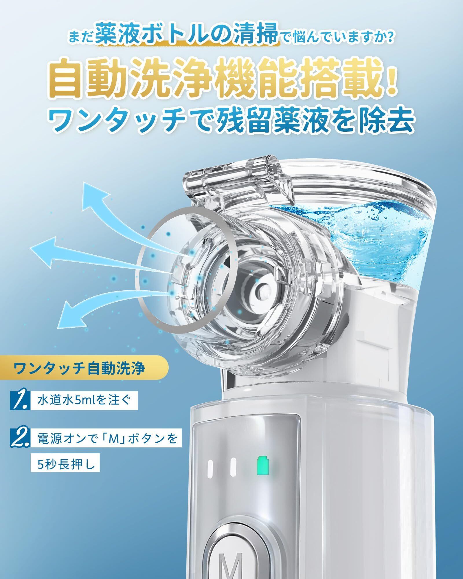 【自動洗浄機能&液体検知機能】自動洗浄機能を搭載し、薬液の残留を取り除きます。モードボタンを5秒間長押しするだけでメッシュプレートを洗浄でき、安定した霧化性能を維持。薬液カップにはU字型底面構造を採用し、薬液を噴霧口へ集めることで残液量を約0.1ml以下に抑制、薬液の利用効率を高めます。さらに、液体検知機能により、非対応の液体(精製水など)の使用時や薬液が切れた際に自動で停止。手動の設定が不要なだけでなく、メッシュプレートの空運転による損傷を防ぎ、製品寿命を延ばします。お手入れの負担を軽減する設計により、長期間にわたって清潔かつ安定した状態を保ち、毎日の霧化をよりスムーズにサポートします。