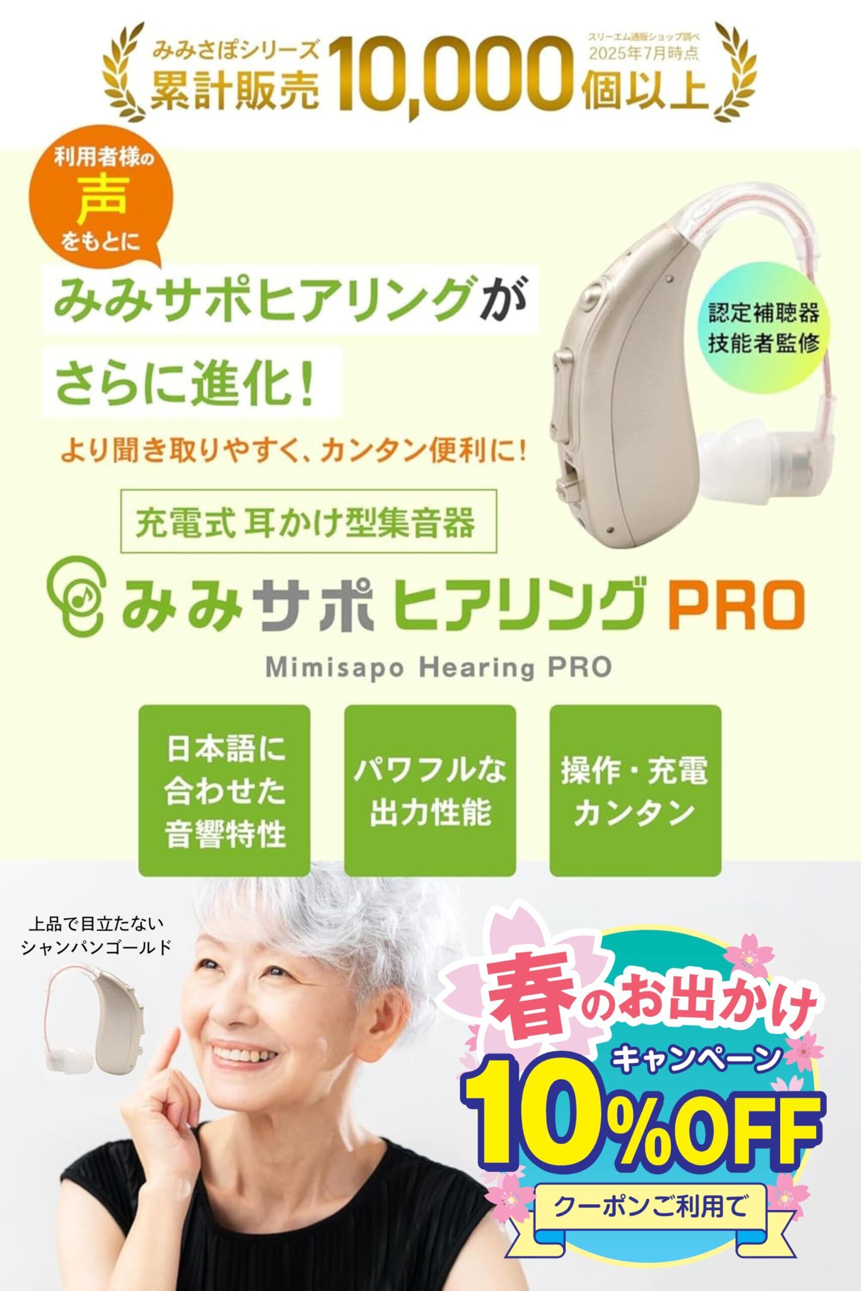 【利用者様の意見をもとにリニューアル!】シリーズ累計10,000個以上販売のみみサポシリーズ。多くのお客様の声をもとに、みみサポヒアリングがさらに進化しました!バージョンアップした「みみサポヒアリングPRO」は、最先端の集音プログラムを搭載し、より自然な音質と、使いやすさを両立しています。耳かけ型の集音器(しゅうおんき)で、イヤホンのような軽さと快適な装着感を実現。高齢者でも使いやすい集音器(しゅうおんき)で、電源を入れるだけですぐに使用可能。初めての方や高齢者の方にも、簡単にお使いいただける集音器(しゅうおんき)です。