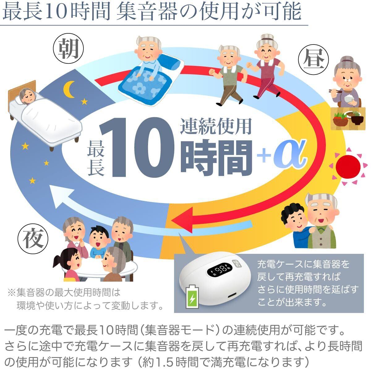 【最長10時間 集音器の使用が可能】一度の充電で最長10時間(集音器モード)の連続使用が可能です。さらに途中で充電ケースに集音器を戻して再充電すれば、より長時間の使用が可能になります(約1.5時間で満充電になります)