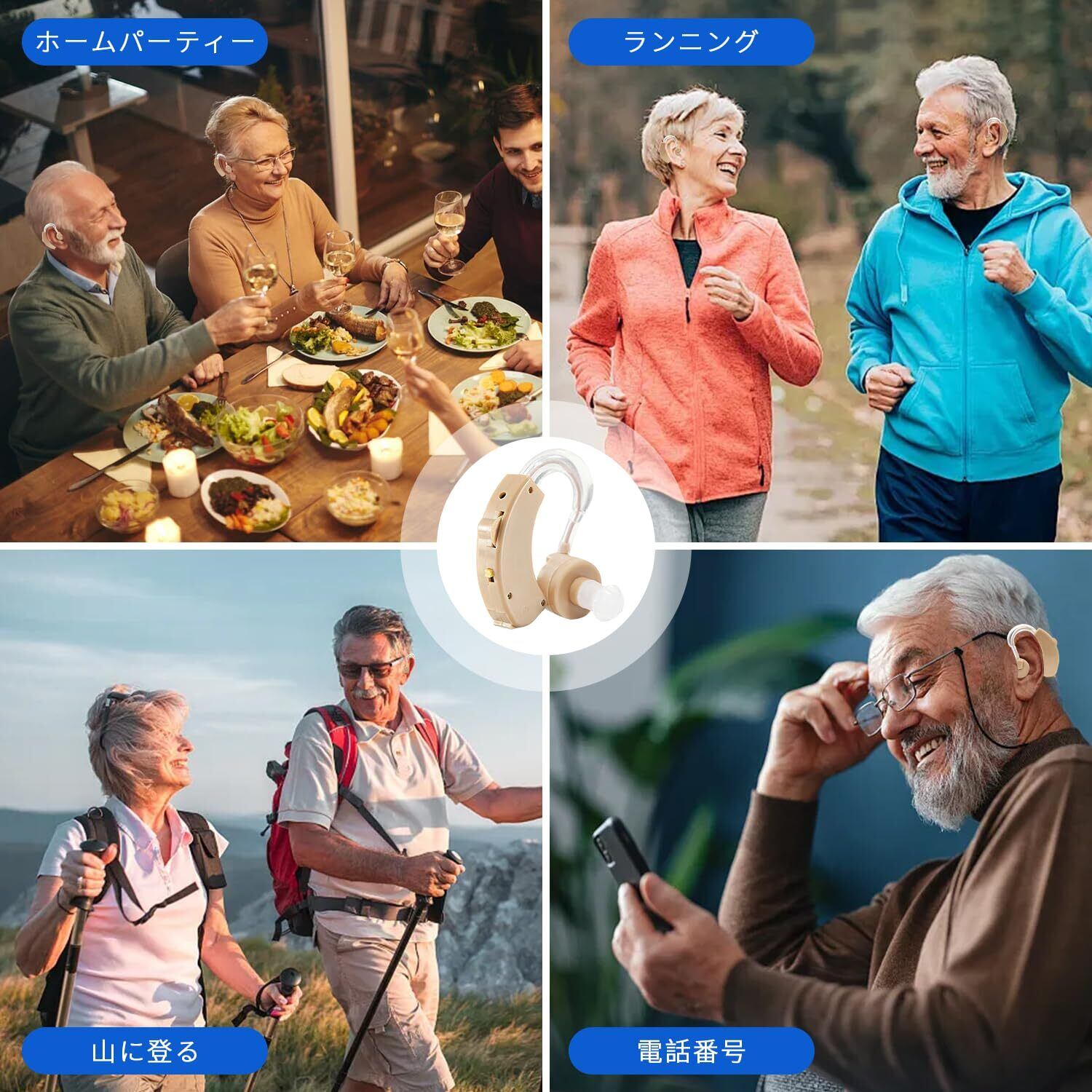 高齢者向け集音器、軽量でコンパクトなデザイン、ノイズキャンセリング機能、クリアな音質、左右兼用・簡単操作、快適なフィット感、6段階音量調墪、持ち運びに便利な収納ケース付き
