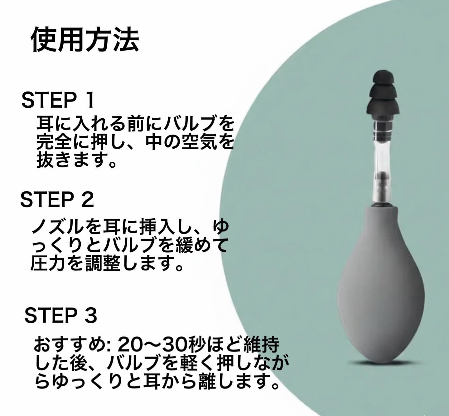 「その耳の詰まり、ガマンしていませんか?」 飛行機に乗った時のキーンとする感じ、天気が悪い日の頭の重さ、スッキリしない耳の違和感……。 「耳圧リフレッシャー」は、そんな日常のストレスを物理的な空気調整でサポートするために生まれました。 ■ なぜこのツールが必要なのか? 私たちの耳は、内部と外部の気圧バランスが崩れると不快感を感じます。本製品はポンプを操作することで耳内部の空気圧にアプローチし、自然な感覚を取り戻す手助けをします。 ■ こんな方におすすめ: ・飛行機や新幹線の移動で耳が痛くなりやすい方 ・気圧の変動で頭の重さやどんより感を感じる方 ・鼻詰まり等により耳抜きがスムーズにいかない方 ・リフレッシュして頭をスッキリさせたい方