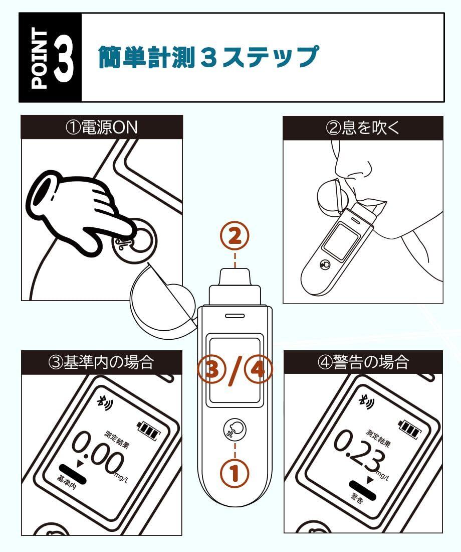 【簡単測定・測定結果見やすい】ボタン押すだけで測定、操作簡単!運転前の負担にならない。大きなLCDディスプレイで測定結果が一目でわかるし、視認度が高く見えやすいです。また、測定状況に応じて警告音も鳴ります。