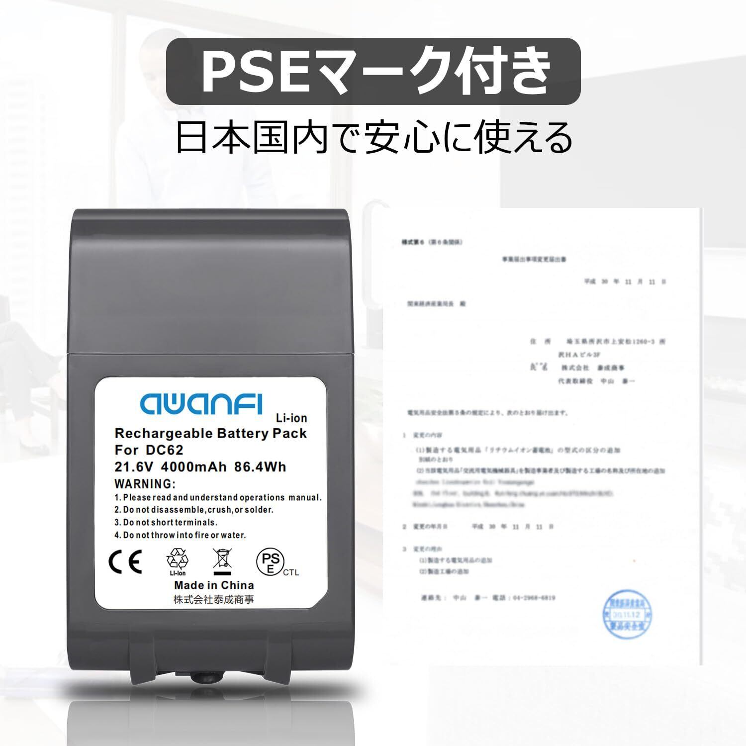 【PSEマーク付き、保護機能内蔵、安全な互換バッテリー】1️⃣過電流保護、過充電防止、過放電防止、低電圧保護など保護機能が搭載されています。バッテリーの使用安全を確保します。2️⃣日本電気用品安全法に従って、PSE検査済でマークを付いています。 日本経済産業省に電気用品製造事業を承認される互換バッテリーです。3️⃣PSE検査のほか、ISO9001、UN38.8、CE、ROHSなど世界基準の様々な安全規格、品質テストに合格しました。徹底的に安全性を追求しています。ダイソン純正品に遜色無いです。ご安心に使用することができます。(ご注意:資質のない企業が販売している違法な互換バッテリーで発火のことが相次ぎ、経産省から回収命令が出されています。安全のために、PSEマークが付くバッテリーをおすすめします。)