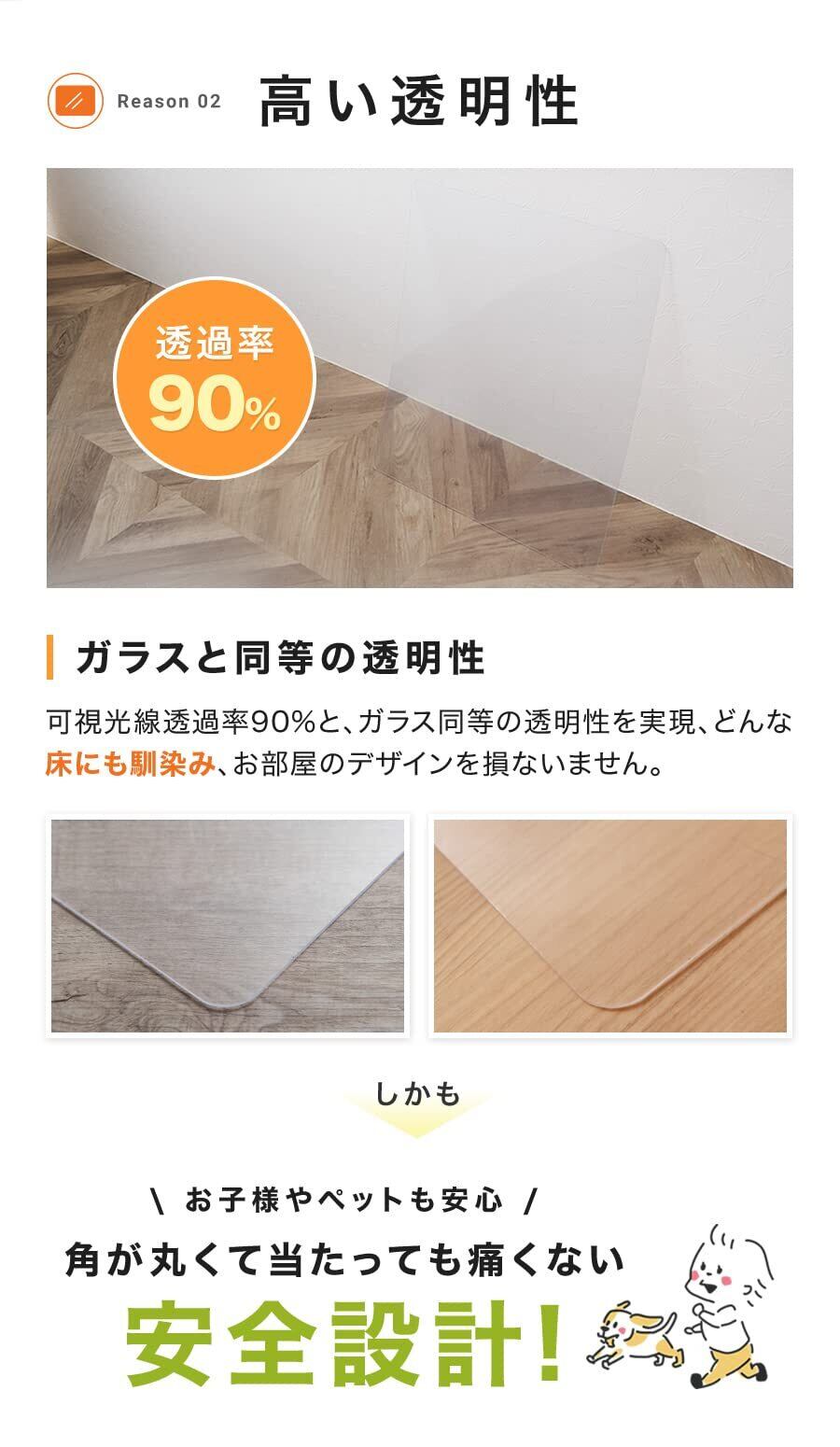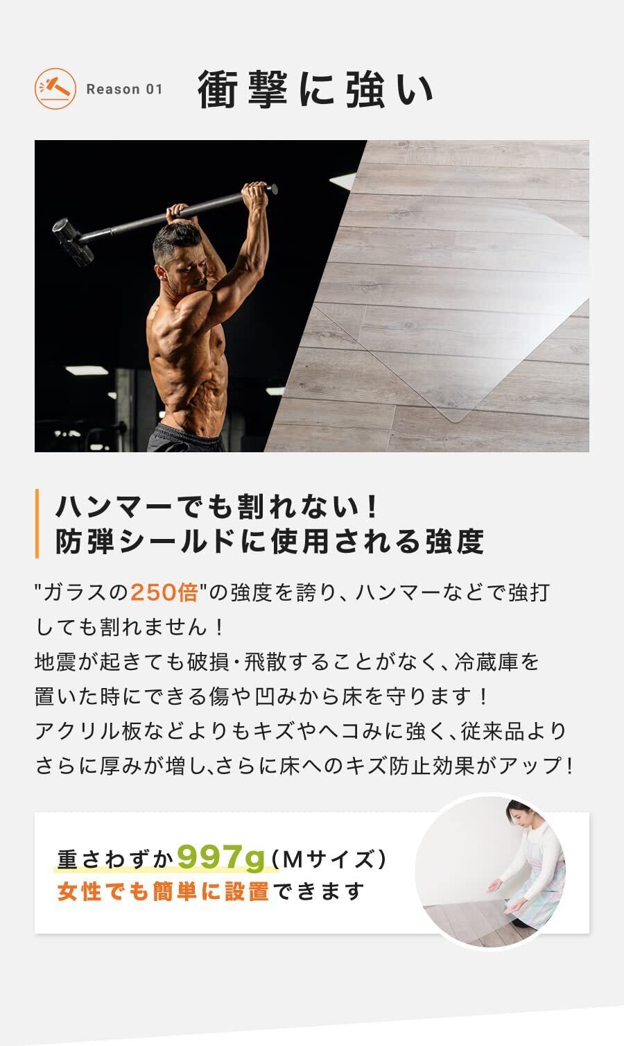 【防弾シールドに使用される程の強度】"ガラスの250倍"の強度を誇り、ハンマーなどで強打しても割れません!地震が起きても破損・飛散することがなく、 冷蔵庫 を置いた時にできる 傷 や 凹み から床を守ります!従来品より厚みが増し、さらに床への キズ防止 効果がアップ!重さわずか997gで(Mサイズ)女性でも簡単に設置できます 【ガラスと同等の透明性】可視光線透過率80-90%と、ガラス同等の 透明 性を実現!どんな床にも馴染み、お部屋のデザインを損ないません。