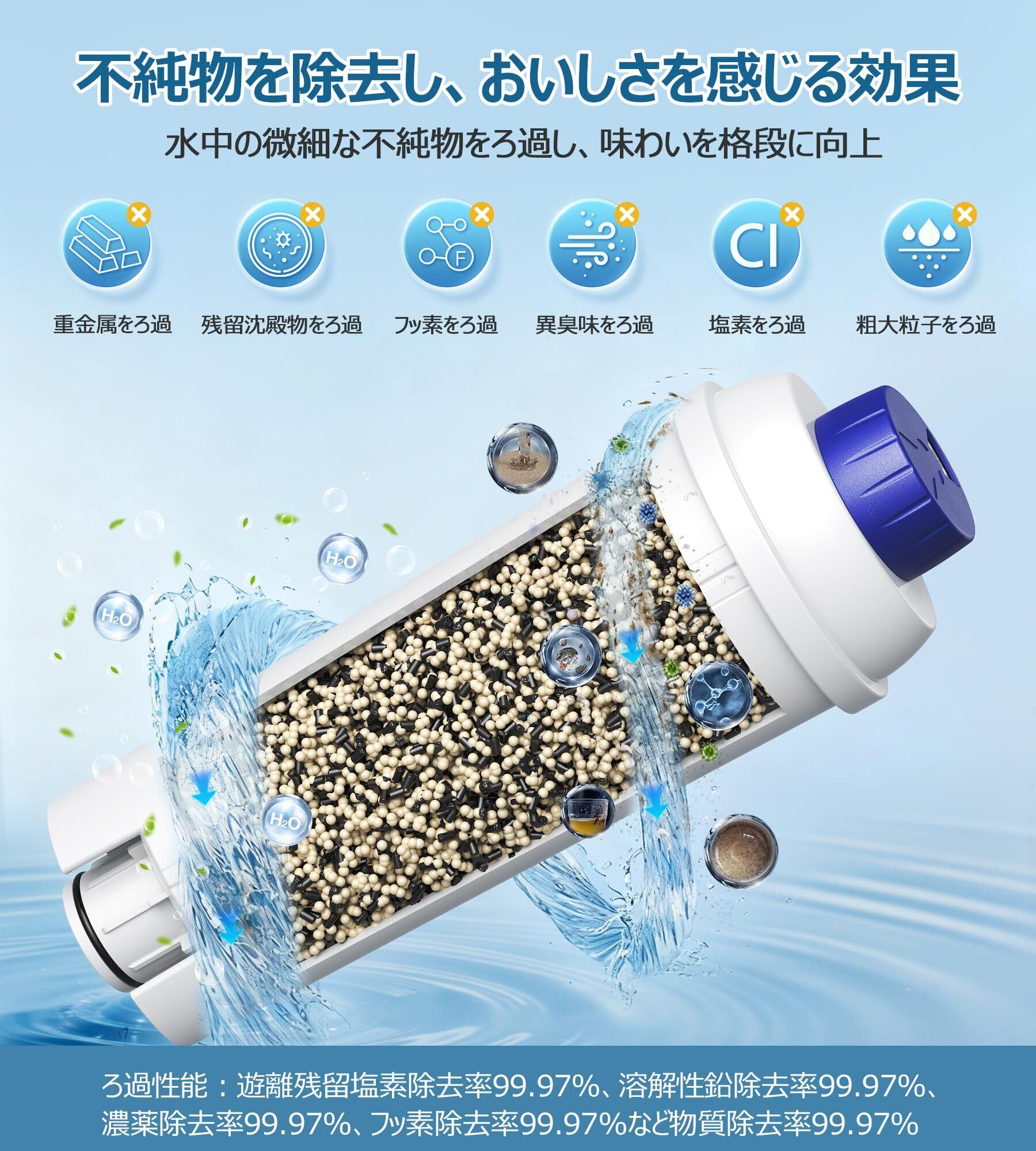 【徹底的な不純物除去で、水の味を革新する超高精度フィルター】「0.3ミクロン」という肉眼では見えない微細な粒子から、残留塩素、サビ、重金属(鉛など)まで、業界でも高水準の「99.97%」の除去率を実現しました。
