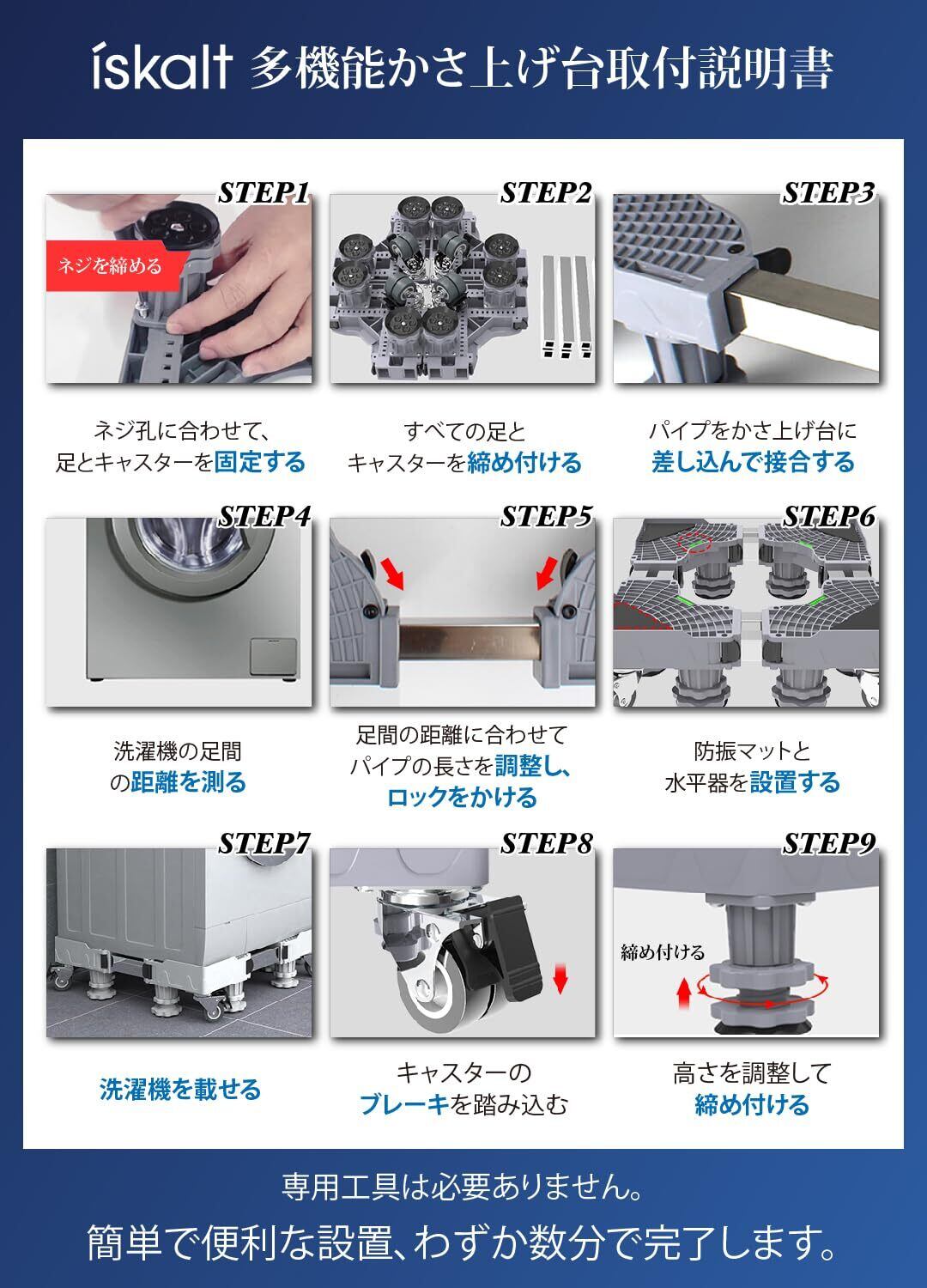 【半完成品/組立簡易】設置前には必ず取扱説明書をご確認ください。この洗濯機 キャスターを組み立てるのは簡単です。面倒なネジ締め作業はにお任せ、半完成品だから、組立はパイルを入れ、ロックをかけるだけ、主婦一人でも組立が完了できます。商品到着後30秒で組み立て完成!忙しい家庭に最適で、時間とエネルギーを節約しつつ、電化製品の強固で安定した土台を実現します。組み立てが簡単で、利便性は最大限です。手間がかかりません。