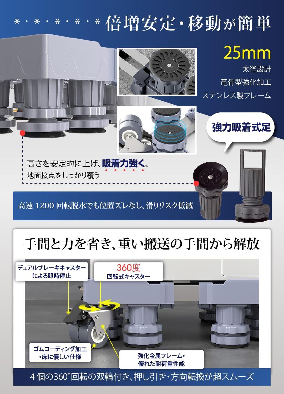 【耐荷重800kg、騒音・振動の低減】 黒い防振パッドがあり、滑りを防ぎ、脱水時のノイズを最小限に抑え、振動を吸収します。また、滑りを防ぎ、洗濯機本体を安定させることで、スムーズで静かな作動を実現します。同じ規格の製品の耐荷重能力をはるかに超えています、耐荷重も800kgまで達します。より多くの家電製品が対応できます!幅広いサイズの洗濯機にもお使いいただけます。
