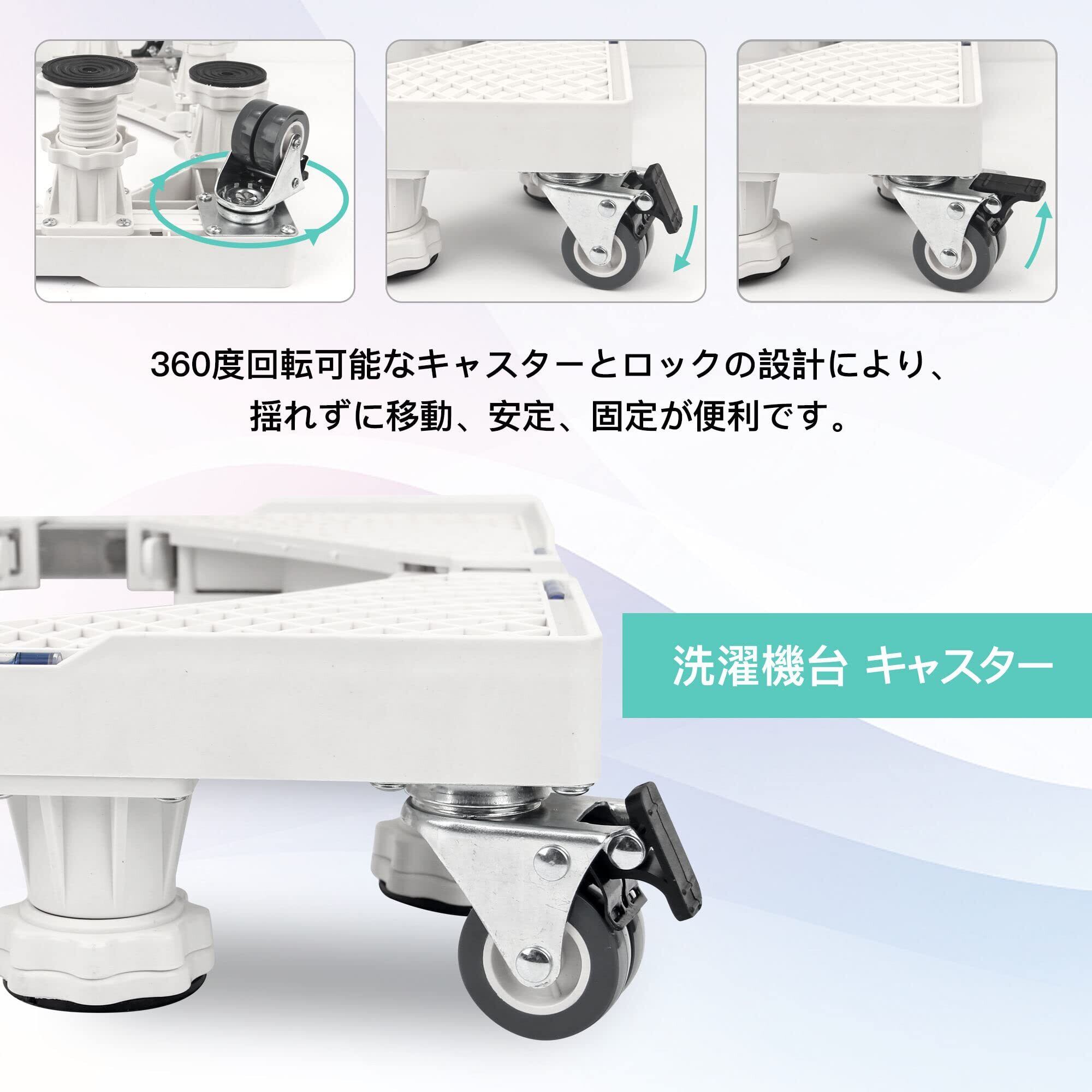 八足四輪/高安定性:大型ジャッキ8本、キャスター4本が付き、伸縮可能、高さ調整、移動可能な洗濯機置き台。ステンレス鋼とABS樹脂を採用して、優れた安定性を保ち、腐食に耐えます。360度移動できる,耐荷重を500kgまで実現します。洗濯機や冷蔵庫との接触を有効に防止できし、排水と清掃問題を簡単に解決します。
