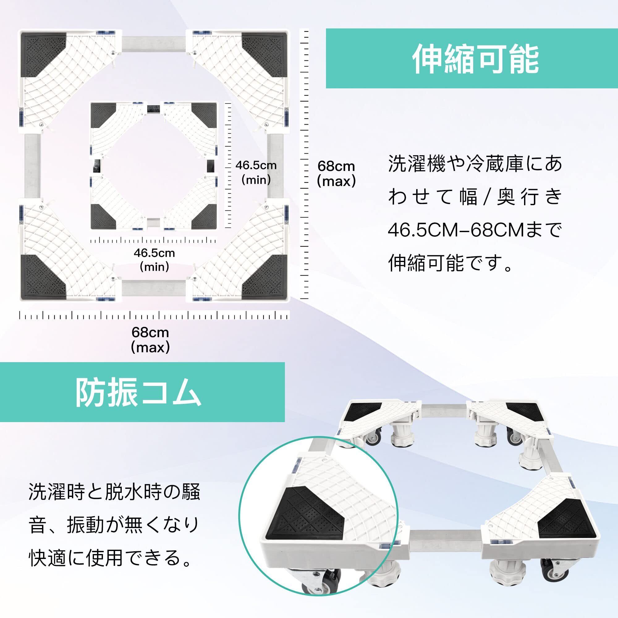 伸縮可能/高さ調整:幅調整範囲:45cm-68cm、高さ調整範囲:10cm-14cm、洗濯機や冷蔵庫などの大型家具に合わせて、幅・奥行き・高さを自由に伸縮できます。エアコン、ドラム式や全自動洗濯機、冷蔵庫、食器棚洗濯機、植木鉢、大型機器など、さまざまな家具に使用することができます。