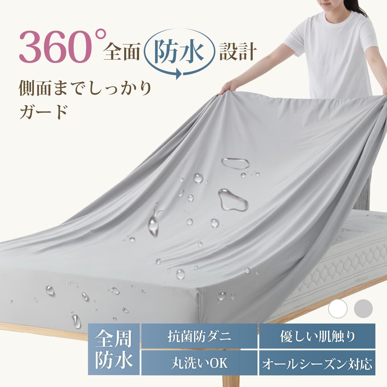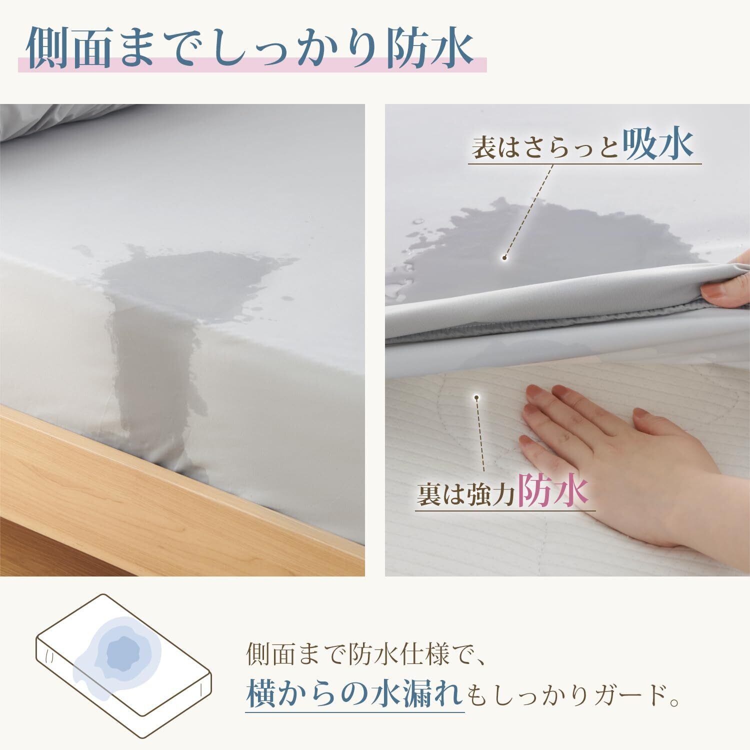 「360度全面防水仕様」裏地にTPU防水コーティングを施し、表面だけでなく側面までしっかりガード。汗や水分、飲み物のこぼれ、おねしょなどからマットレスを360度保護します。
