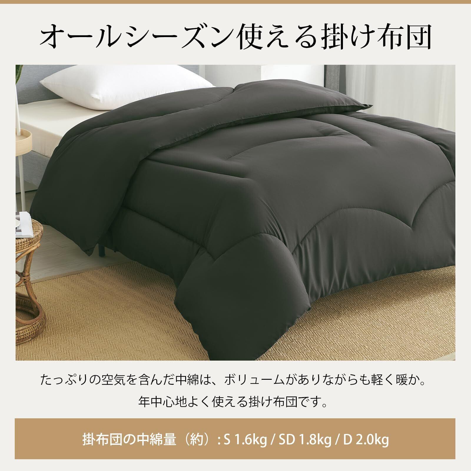 【オールシーズン使える掛け布団】体のラインに沿うボディフィットキルト・曲線キルティング縫製で、布団との隙間を減少、身体、首元や肩口にピッタリフィットして、暖かい空気が逃げにくくなっています。中心がストロー状の中空構造になった「中空ポリエステルわた」を採用しているので、繊維一本一本に空気をたっぷり含みますので、保温性にすぐれ、ふわっと軽くて体への負担を感じさせないです。ふわふわとした気持ちの良いクッション性があります。羽毛の臭いが苦手、のどの弱い方にオススメです。