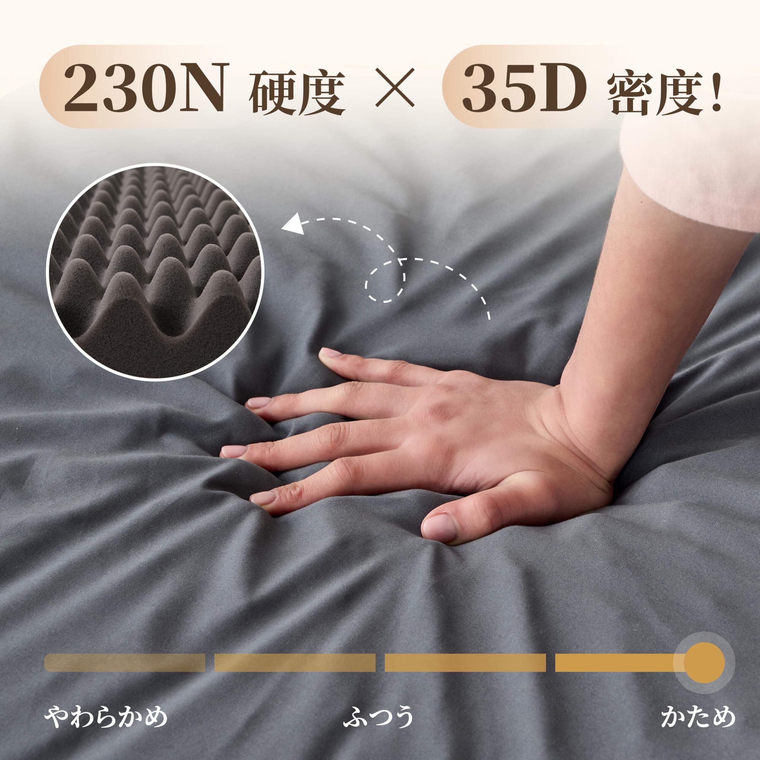 【高密度35D×230N高反発で、長持ち&腰サポート】耐久性に優れた高密度35D素材を採用。長期間使用してもへたりにくく、形状を長く維持します。さらに230Nの純度高反発特性が合わさり、沈みすぎず適度な反発力で腰部をしっかりと支え上げ、理想的な背骨のアライメントをキープ。腰への負担を軽減し、疲れを残さない朝を迎えられます。
