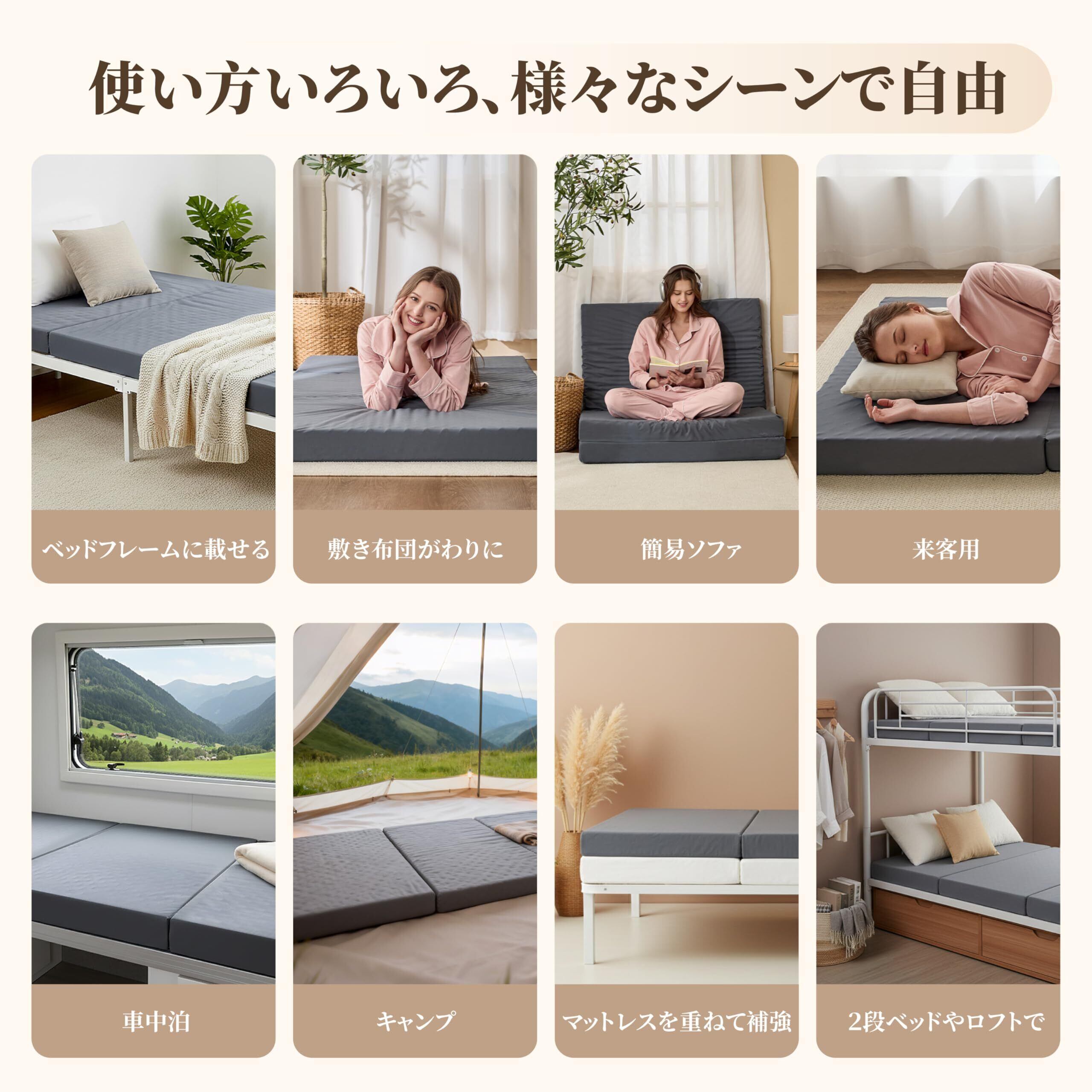 【三つ折り&軽量設計で、あらゆるシーンに柔軟対応】簡単な三つ折り構造と軽量化を実現。広げればしっかりした厚さ10cmの寝床に、畳めばスリムでコンパクトに収納可能。付属の収納袋に入れて持ち運びも楽々。キャンプや車中泊はもちろん、急な来客用布団、子供部屋の追加ベッド、あるいは防災備蓄品としても、多様なライフスタイルとシーンでご活用いただけます。