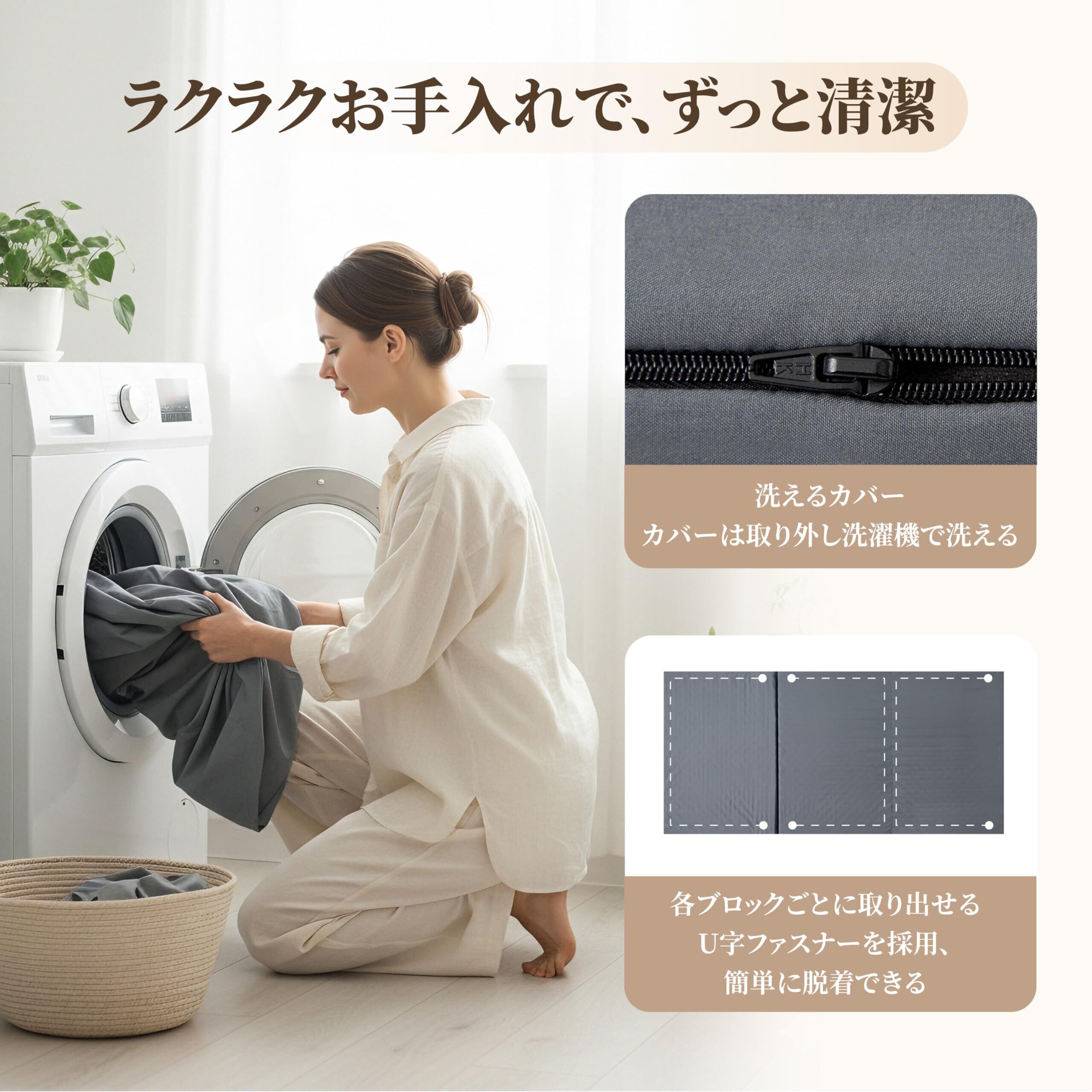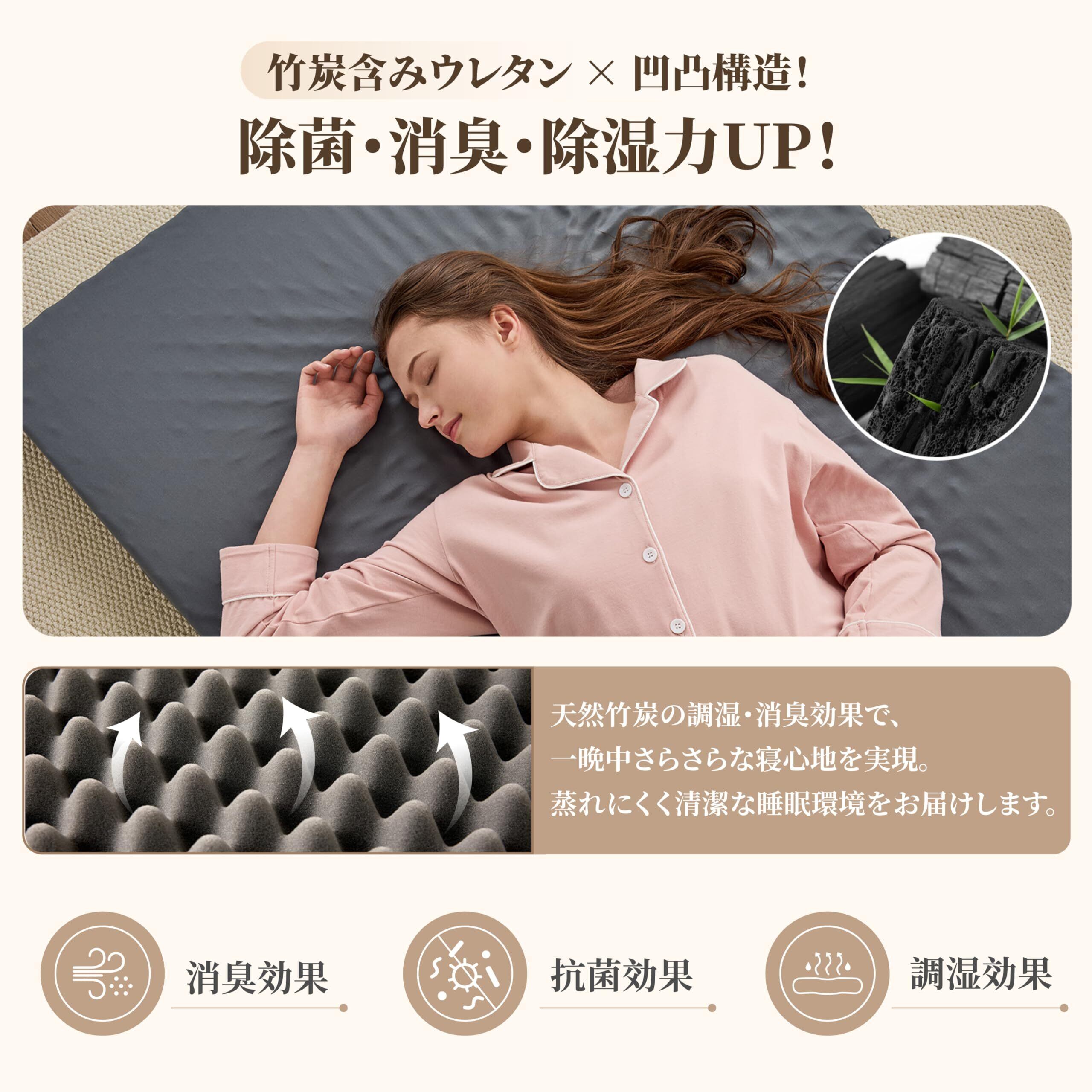 【天然竹炭によるトータルケア環境】素材そのものに天然竹炭パウダーを配合。竹炭の優れた多孔質構造が、睡眠中の汗や生活臭を吸着・分解し、不快なニオイの発生を抑制。同時に高い抗菌・防臭効果と調湿機能を発揮し、マットレス内部を清潔でサラッとした状態に保ち、衛生的な寝床環境を提供します。